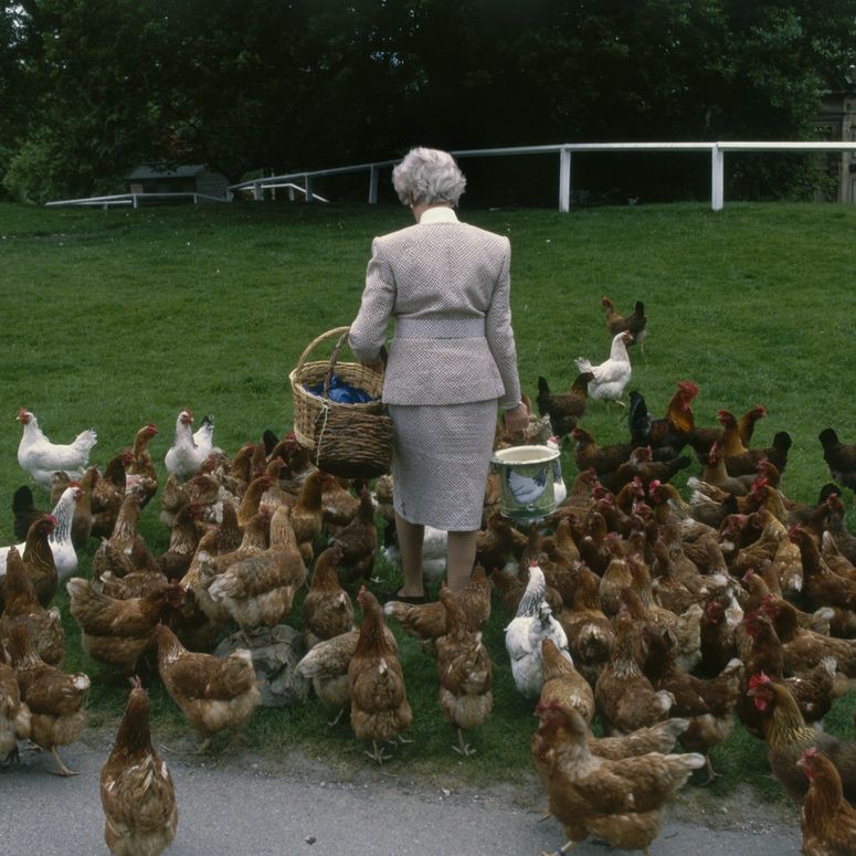Deborah Cavendish, de soltera Mitford, duquesa de Devonshire, da de comer a las gallinas en Chatsworth House, Derbyshire, década de 1990.