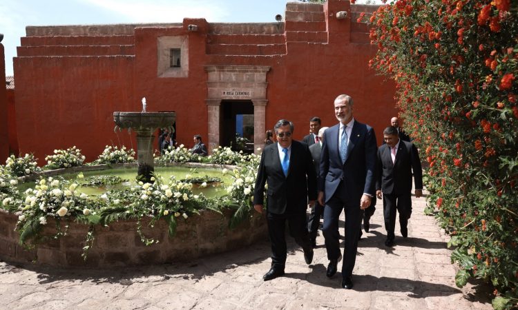 El recorrido continuó por el Monasterio de Santa Catalina de Siena, uno de los conjuntos arquitectónicos más importantes del país. Allí fue recibido por las autoridades locales y por el equipo del convento, que ofreció un almuerzo en el marco del CILE. Durante su visita, el gerente del monumento explicó al monarca la historia y la arquitectura del convento fundado en 1580, considerado una joya del patrimonio colonial arequipeño.