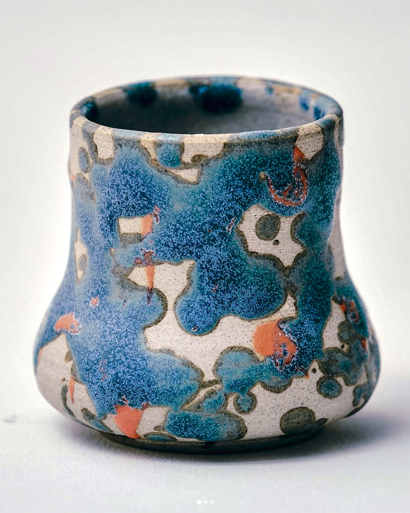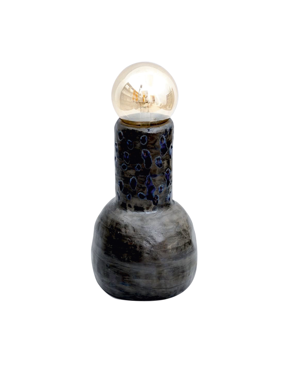 Pieza única en cerámica de alta temperatura. Cristales de Murano engastados y teñidos con óxido de cobalto en el horno, generando tonos azul profundo característicos.