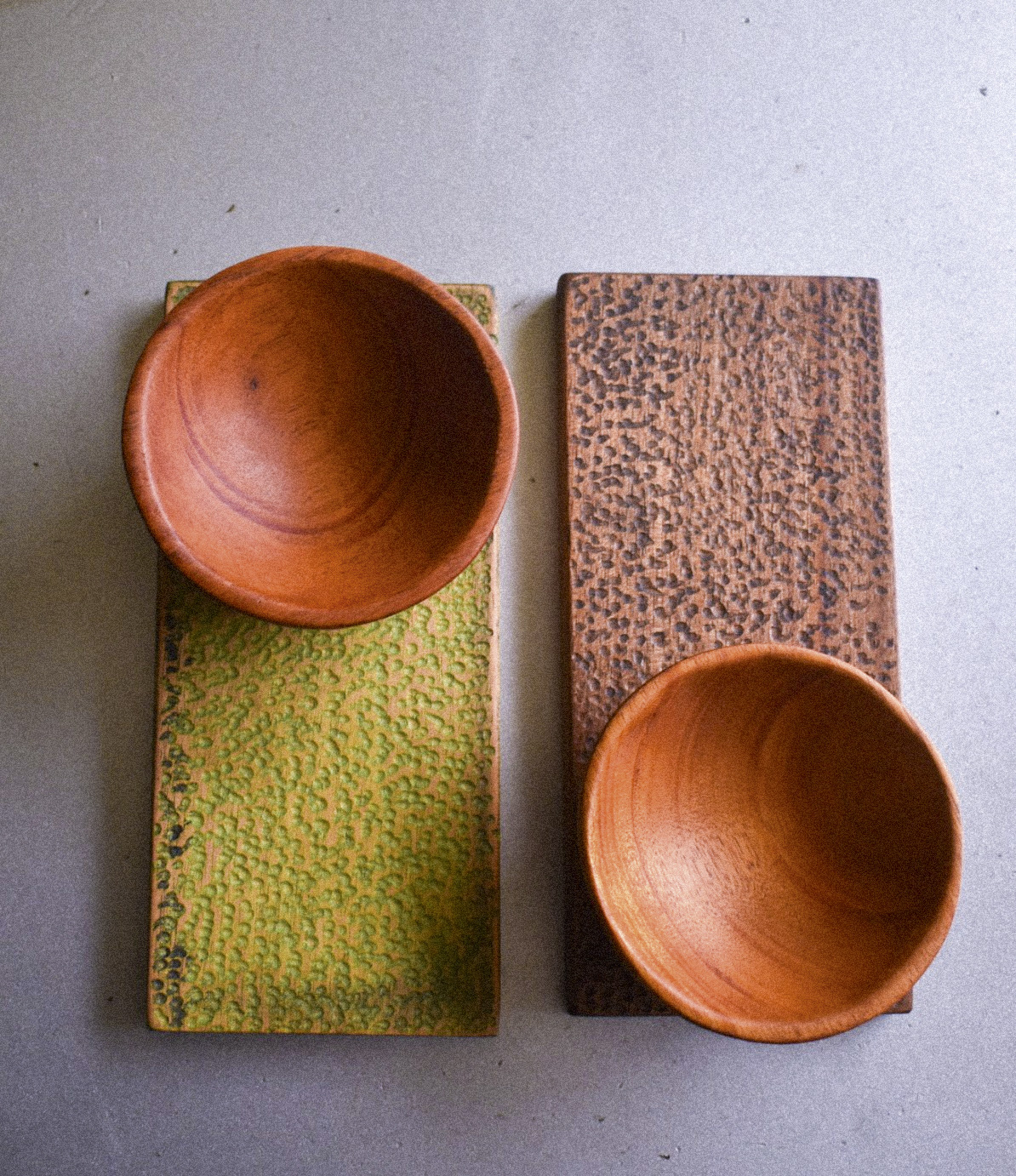 Cuencos y bandejas de madera recuperadas de troncos, raíces y ramas caídas en Perú.