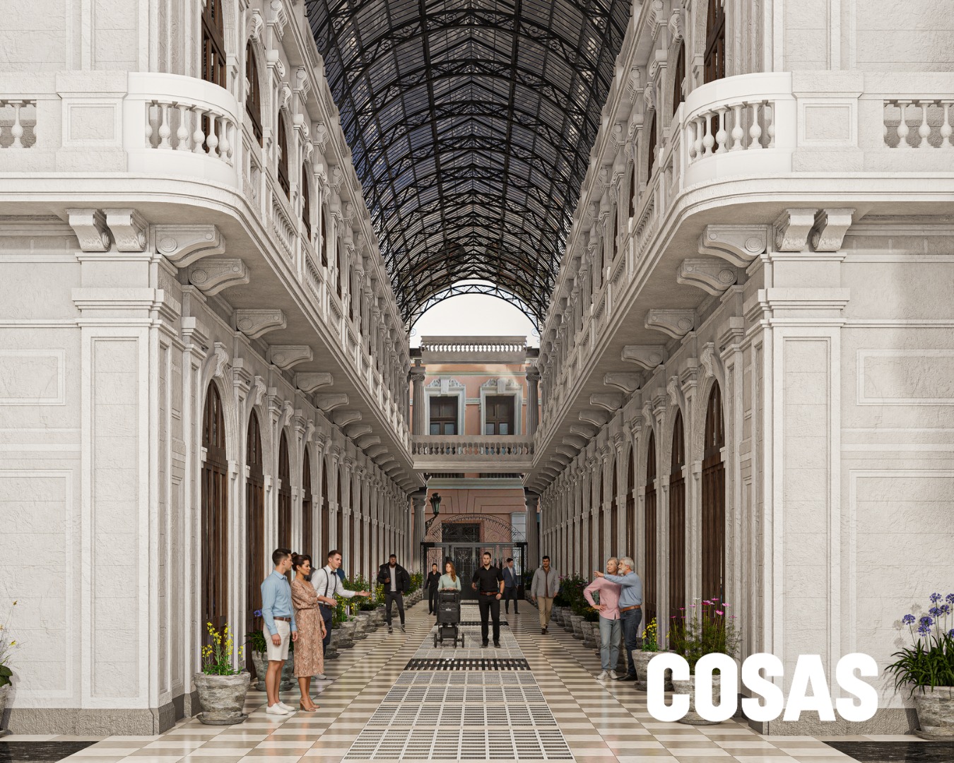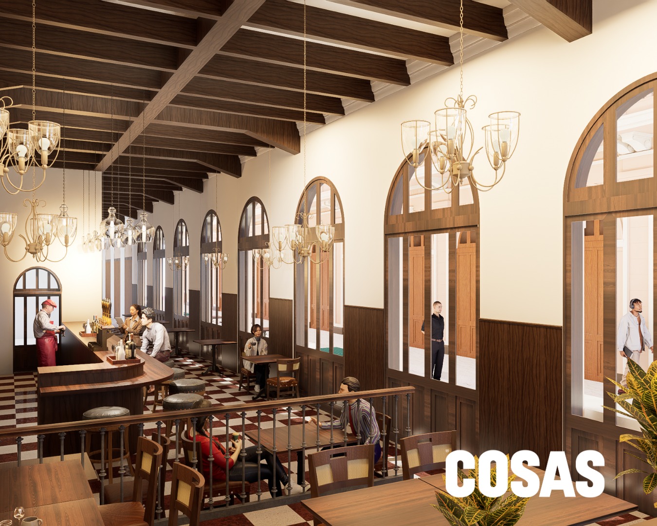 Visualización de un restaurante integrado a la recuperación arquitectónica del antiguo complejo postal del Centro Histórico.