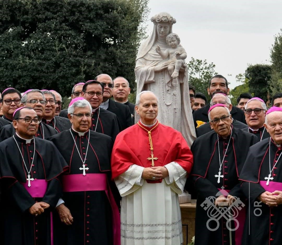 El Papa León XIV posa junto a obispos peruanos frente a la escultura de Santa Rosa de Lima, inaugurada en los Jardines del Vaticano. Foto: Instagram @artesanosdonboscolima