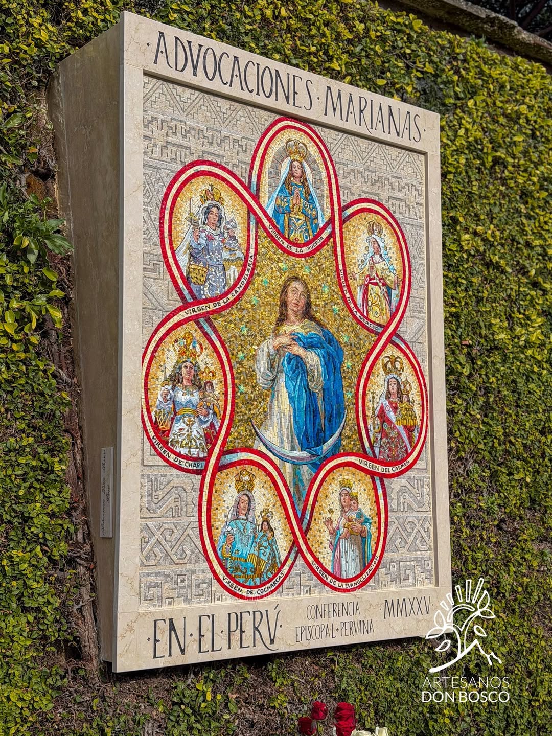 Mosaico mariano diseñado por Lenin Álvarez Medina, integrante de Artesanos Don Bosco, reúne advocaciones de la Virgen veneradas en el Perú y forma parte del Camino Mariano del Vaticano. Foto: Instagram @artesanosdonboscolima
