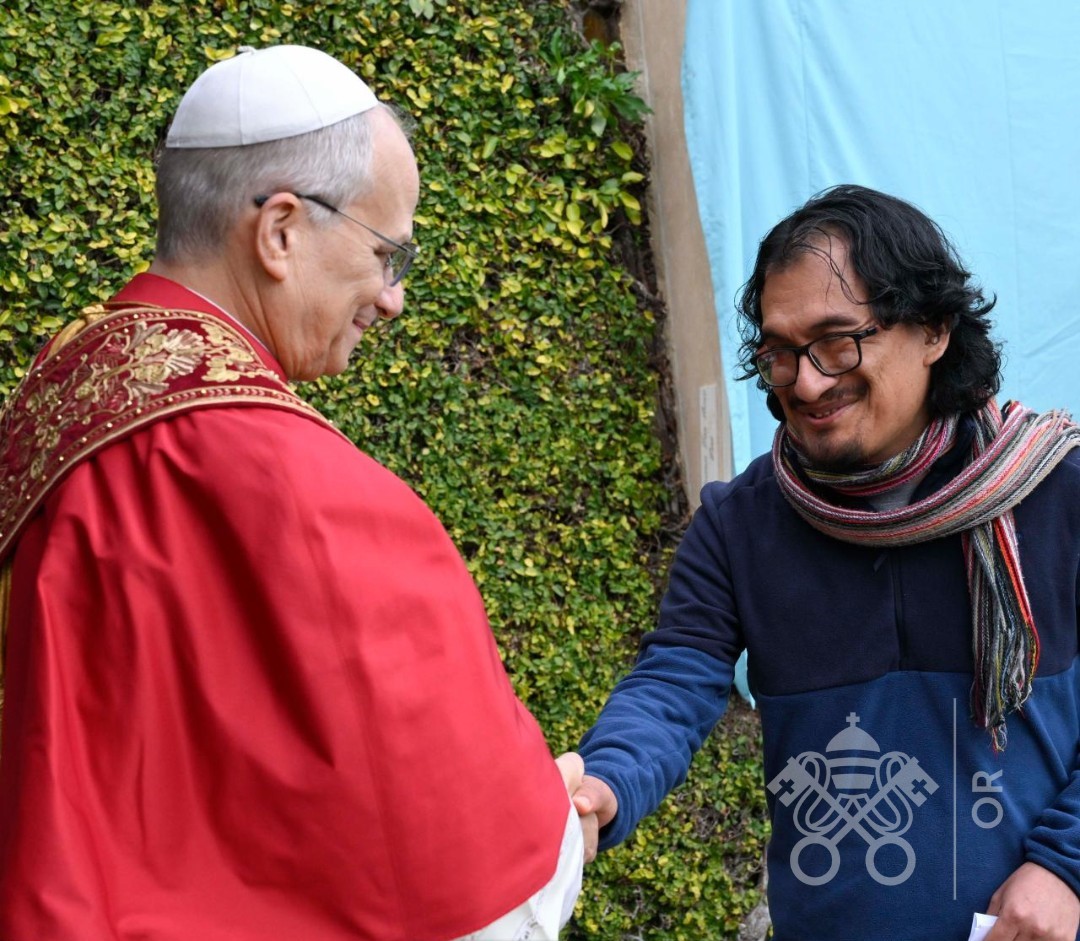 El Papa León XIV junto a Lenin Álvarez Medina, autor del mosaico mariano instalado en el Vaticano. Foto: Instagram @artesanosdonboscolima