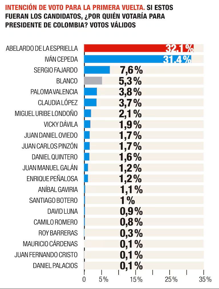 En un balotaje, De la Espriella vencería a Cepeda con 36,8% frente a 34,6%. Cepeda mantiene ventaja frente a otros rivales de centroderecha.