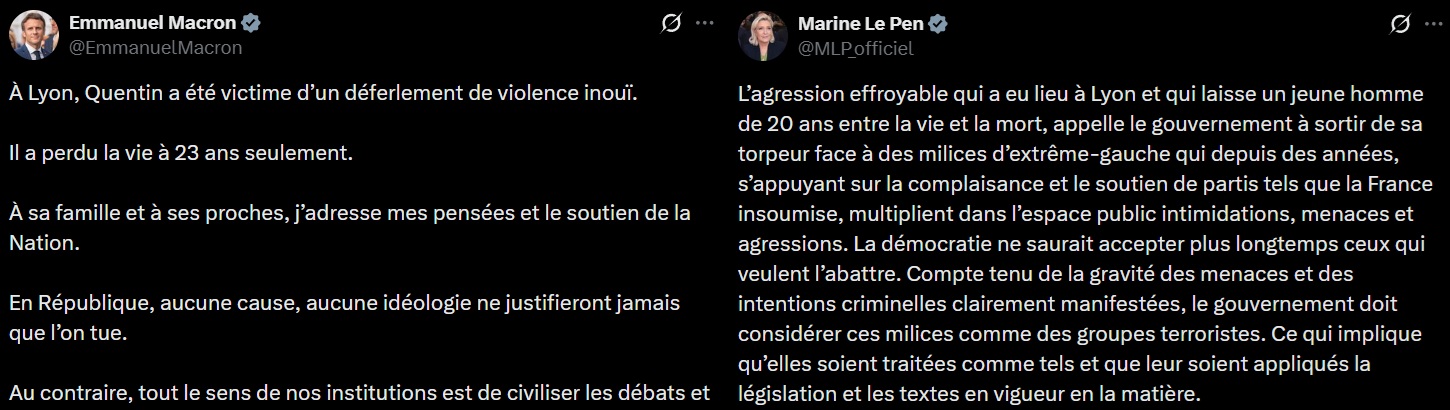 Desde la oposición, Marine Le Pen calificó el hecho como una “ignominia” y exigió justicia rápida, señalando la responsabilidad de la violencia política tolerada en los márgenes ideológicos.