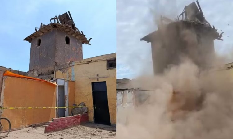 Momento del derrumbe de la cúpula del Mirador del Baratillo, una estructura de más de dos siglos ubicada en el jirón Casma, en el tradicional distrito del Rímac.