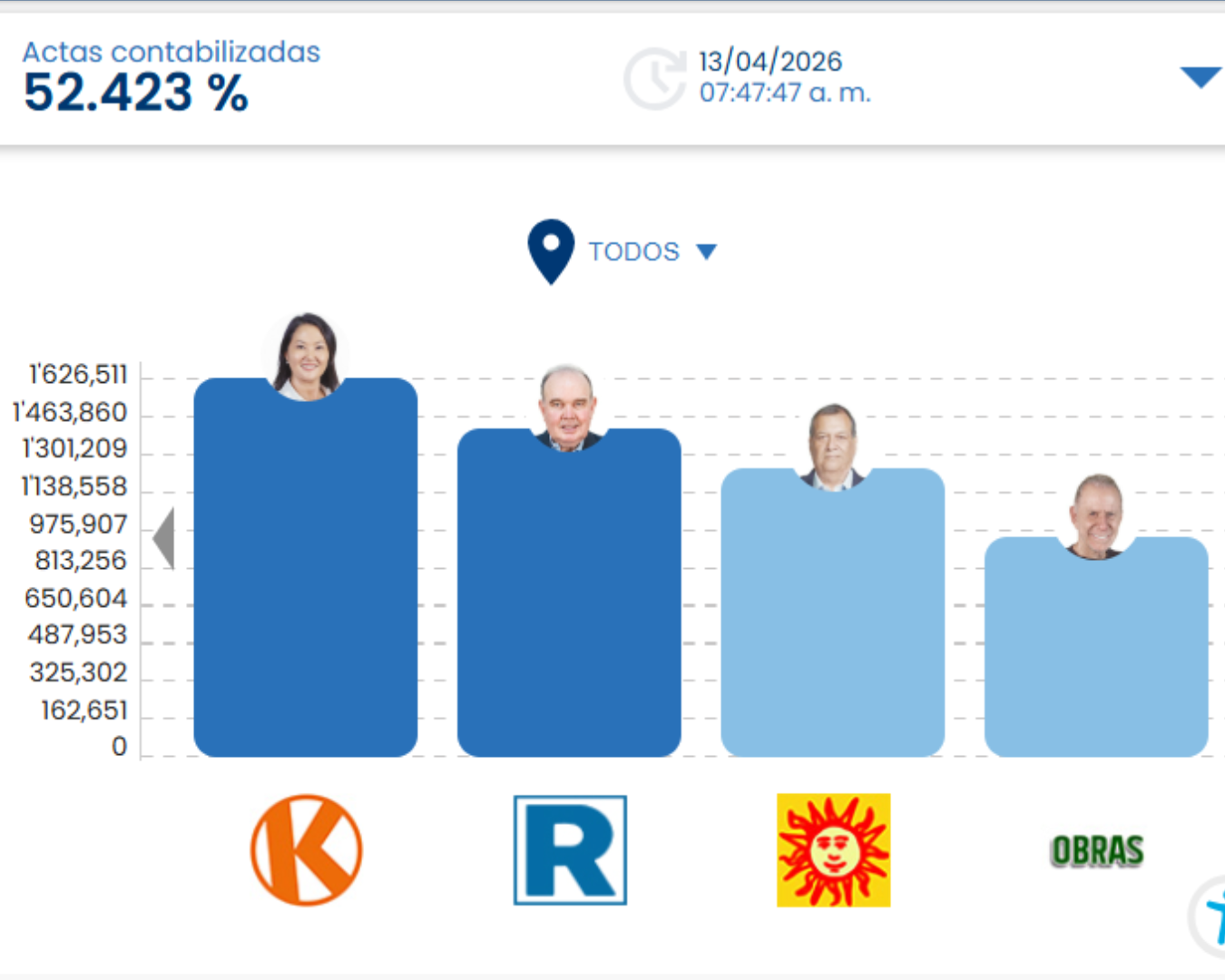 Conteo oficial en tiempo real, con más de la mitad de actas validadas, revela una posible segunda vuelta entre los candidatos del partido Fuerza Popular y Renovación Popular
