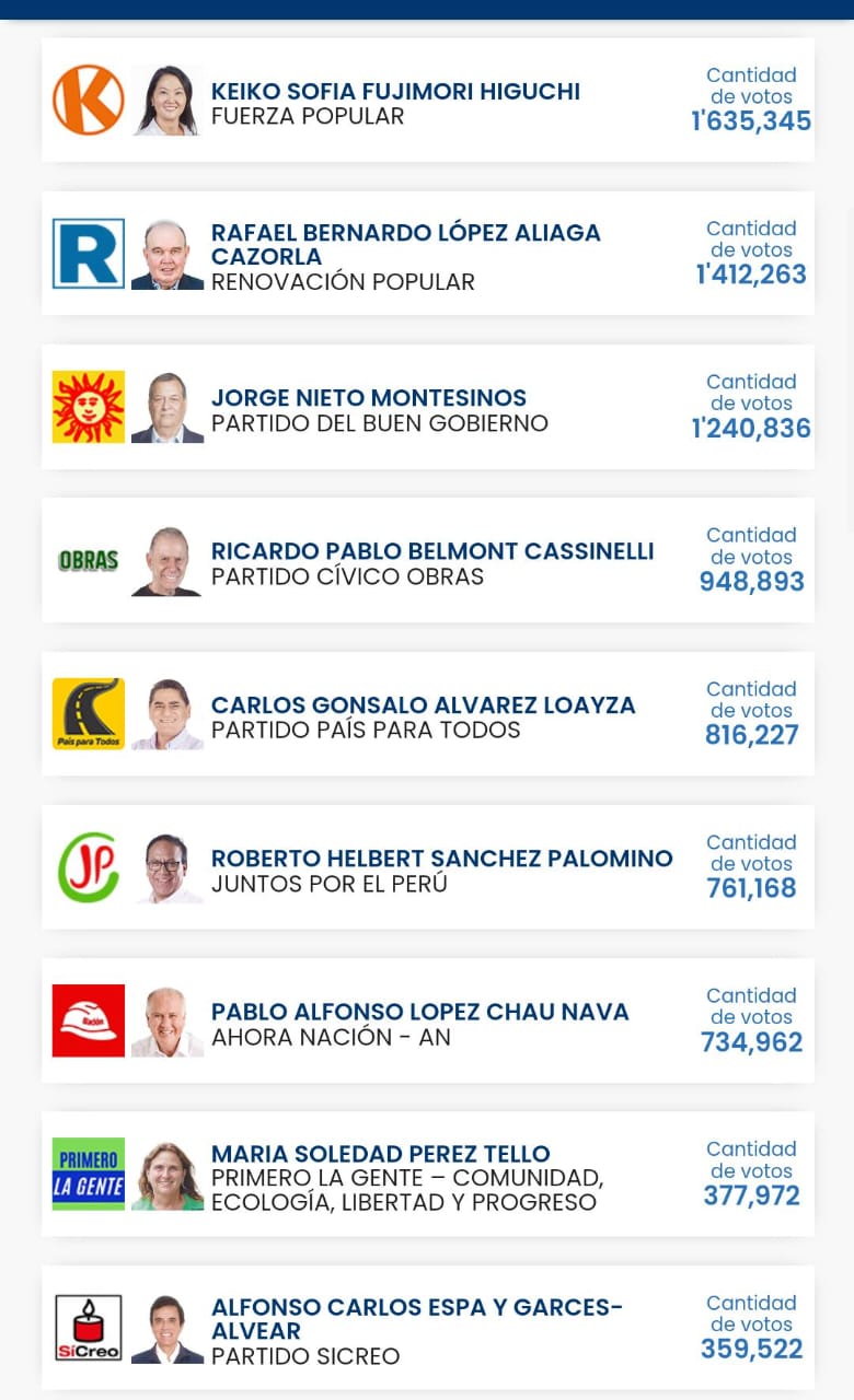 Orden preliminar de votación, según el conteo oficial de la Oficina Nacional de Procesos Electorales.