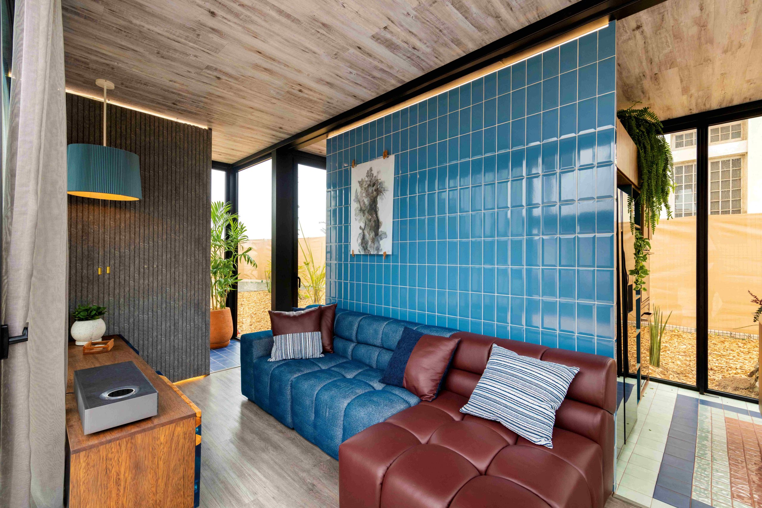 Ahora bien, para Claudia Weis, CASACOR es un laboratorio creativo. Por eso, en “Nido abierto” eligió salir de lo convencional apostando por una paleta vibrante de azules, verdes y naranjas. Los porcelanatos y mayólicas de Cassinelli que seleccionó en esta ocasión destacan tanto por su efervescencia cromática como por las texturas tipo brick, que aportan ritmo al espacio.