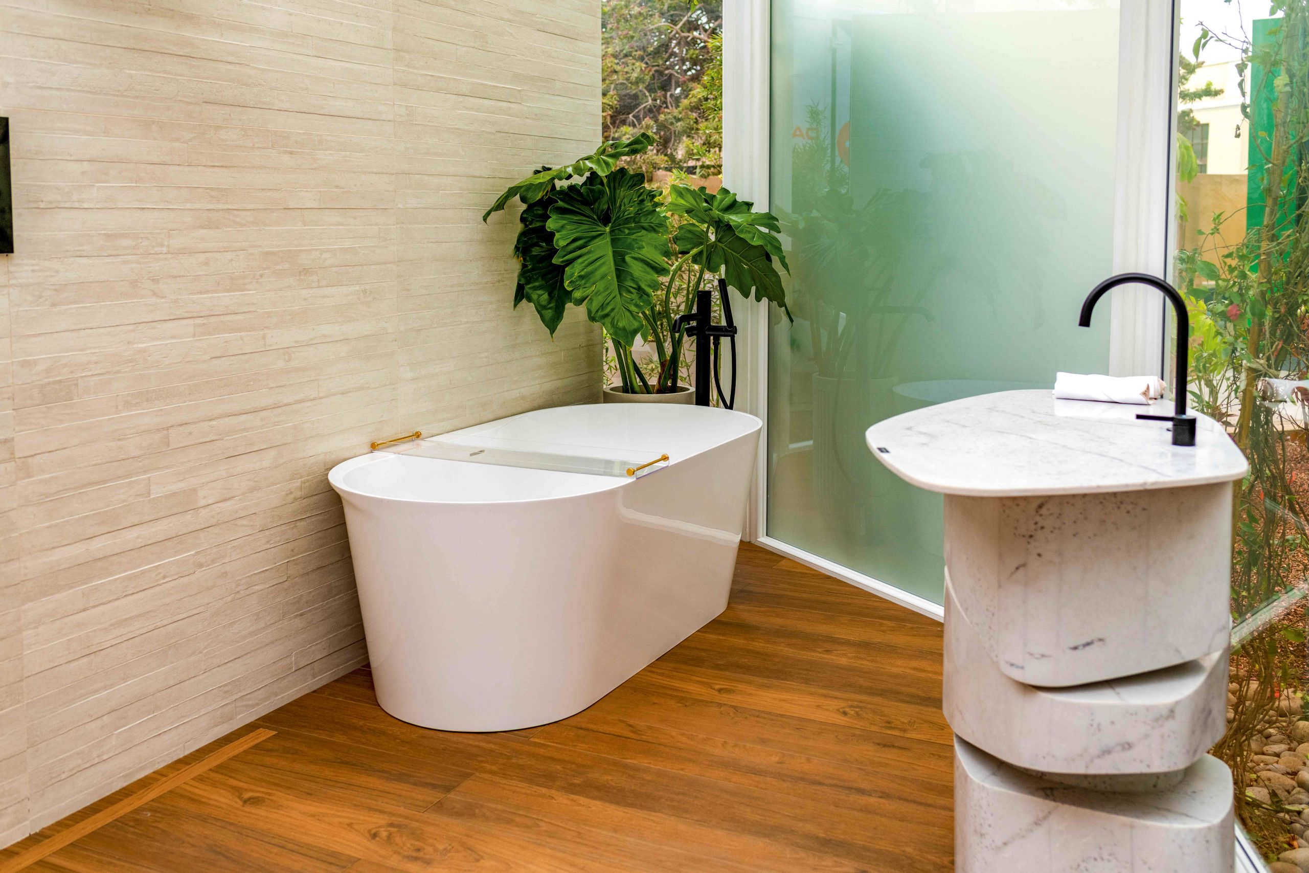 Inspirada en las dunas de Ica, en su “Suite Duna”, Olenka Marquina buscaba texturas claras, pero con carácter, así que optó por un porcelanato de Cassinelli que evoca el terrazo, con pequeñas pintas sutiles que remiten a las conchitas enterradas en la arena. Asimismo, para las jardineras y parte de la fachada, empleó listones curvos que insinúan, desde el exterior, las formas orgánicas del paisaje costero.