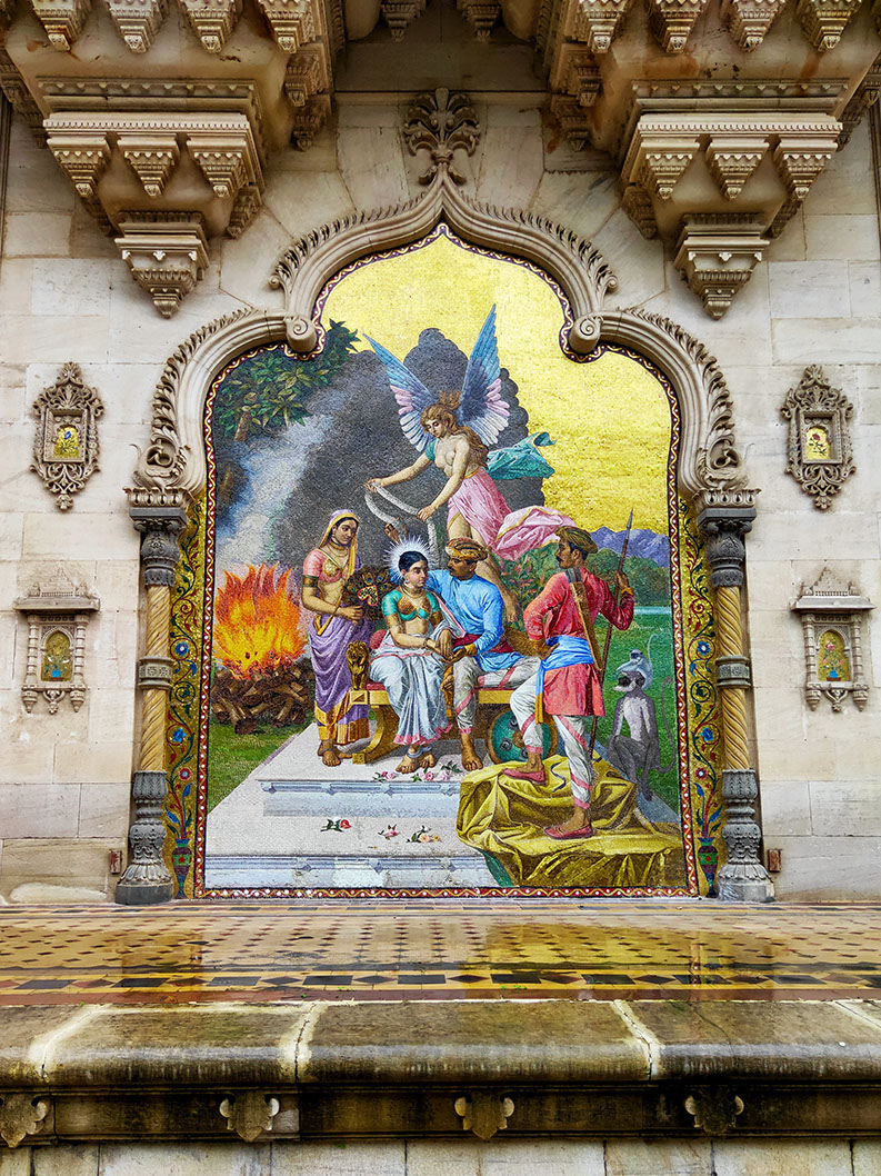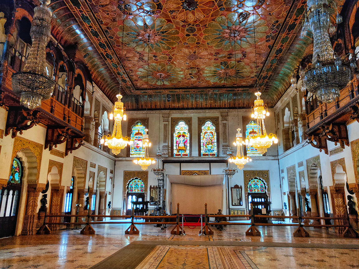 El interior refleja la misma ambición cultural. Los pisos ornamentales fueron traídos de Venecia; las vidrieras, inspiradas en la mitología india, llegaron desde Bélgica; los mosaicos dorados fueron fabricados en Murano. Las esculturas combinan santos indios con figuras europeas, y algunas tecnologías —como un ascensor manual y grandes ventiladores de techo— ya estaban integradas hace más de un siglo.