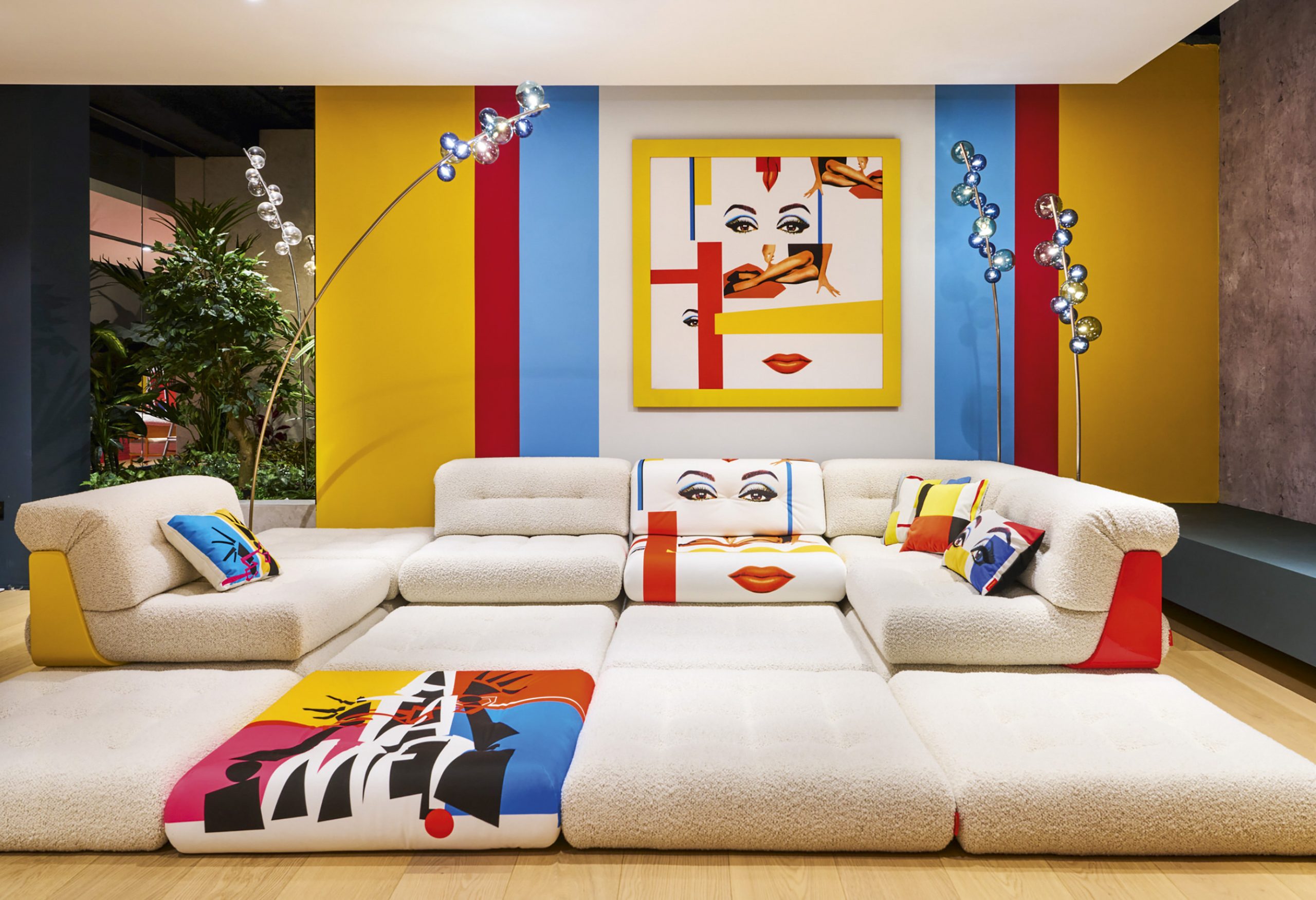 Entre las propuestas que vinculan decoración y figuras del entretenimiento, destaca el icónico mueble Mah Jong de Hans Hopfer, diseñado por Roche Bobois de París en colaboración con Pedro Almodóvar. Con estampados coloridos, desprende informalidad y se transforma en un elemento visual potente.