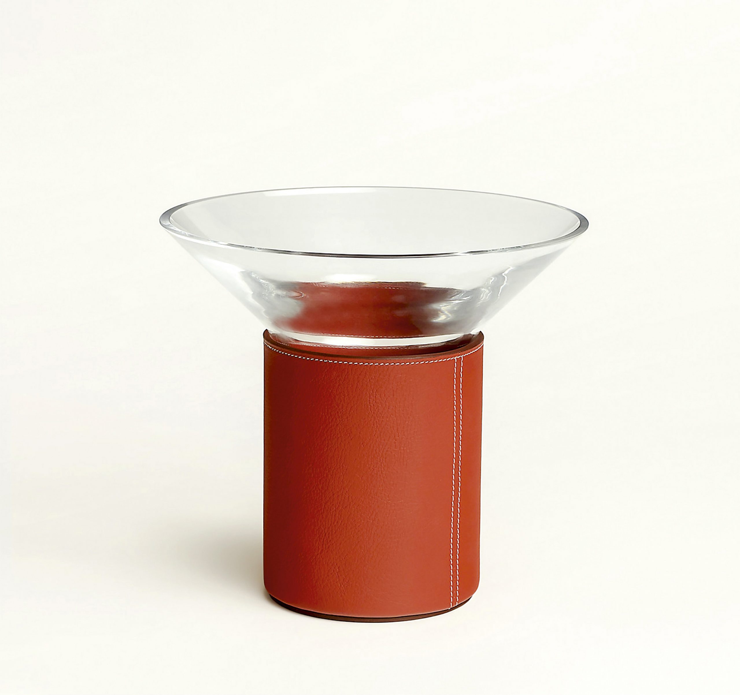 Jarrón Delta elaborado con cristal de Murano soplado, cubierto con una funda de piel rouge brique extraíble y una “H” perforada en su base.