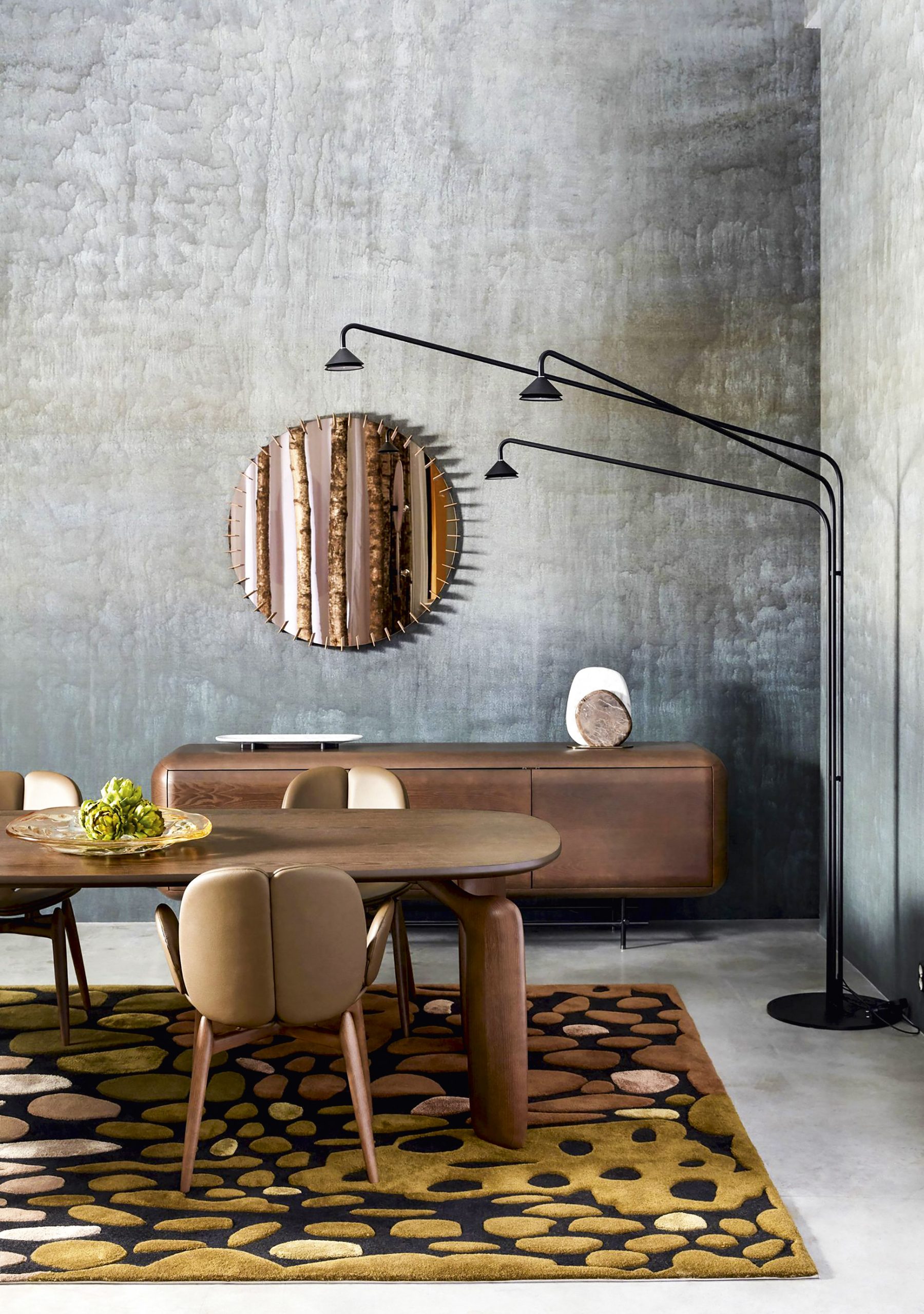 Pensando en la tendencia de asimetría y mezcla de materiales variados, destacan las creaciones de Roche Bobois: el sofá SENSE, con sus formas envolventes y orgánicas que evocan un guijarro suavemente modelado, con materiales de tejido elástico o cuero que se integran con facilidad en interiores modernos y expresivos en un guiño a los años setenta.