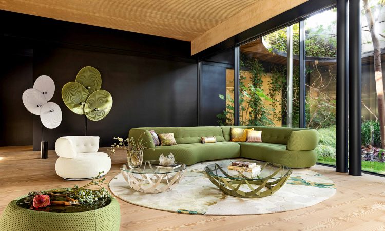 Pensando en la tendencia de asimetría y mezcla de materiales variados, destacan las creaciones de Roche Bobois: el sofá SENSE, con sus formas envolventes y orgánicas que evocan un guijarro suavemente modelado, con materiales de tejido elástico o cuero que se integran con facilidad en interiores modernos y expresivos en un guiño a los años setenta.