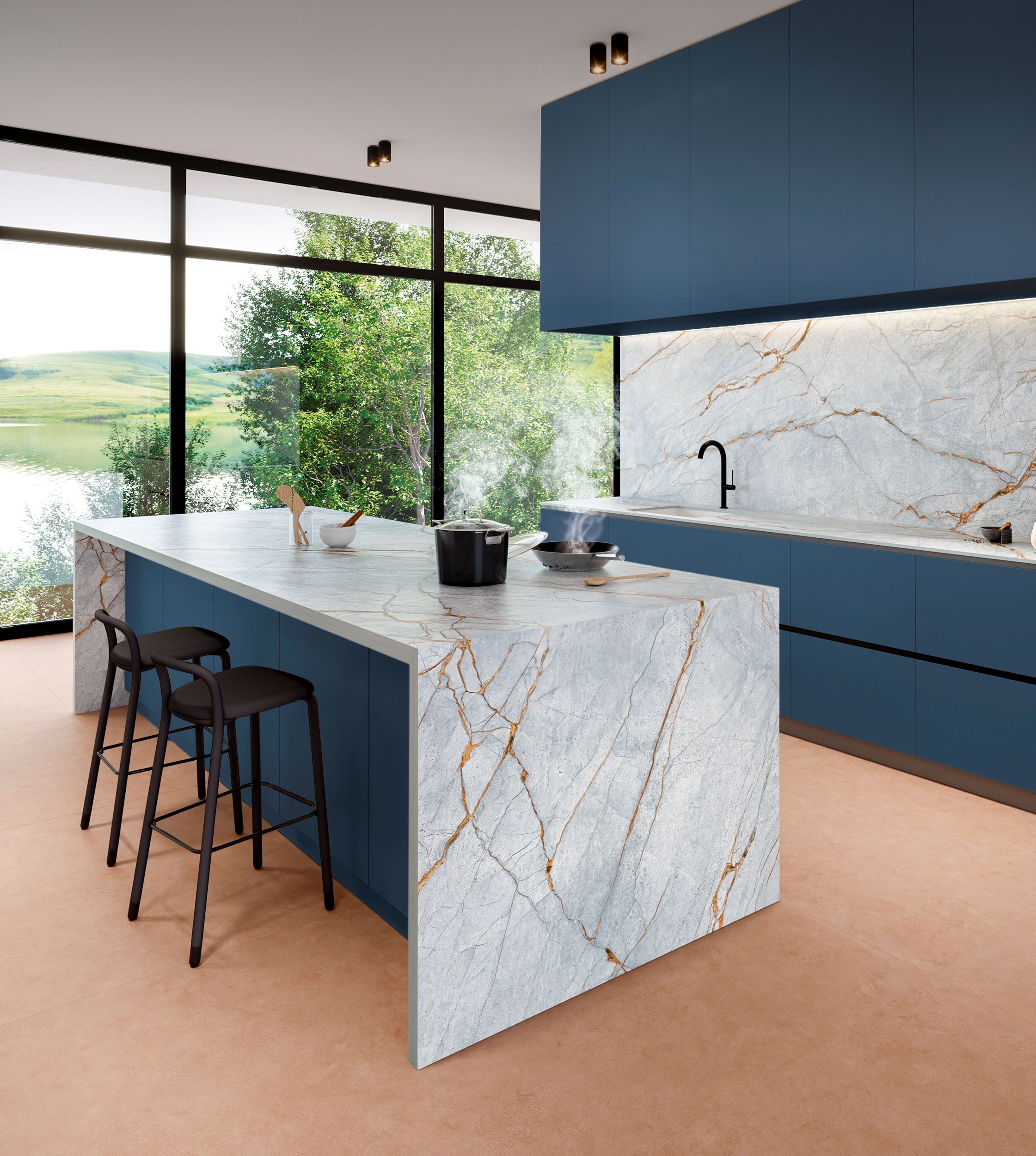 La piedra sinterizada Blue Roma mate de Covelram Top (81 x 324 cm y 12 mm de espesor) está inspirada en la piedra natural de Brasil, con un tono azul grisáceo único atravesado por vetas cobrizas de gran sofisticación. Gracias a la avanzada Carved Technology, reproduce con realismo cada relieve y veta, logrando un acabado natural y envolvente. Su resistencia al calor, a las manchas y a las rayaduras la convierte en la elección perfecta para encimeras de cocina, además de revestimientos y proyectos de interiorismo de alto nivel. Disponible en Rivelsa, donde diseño, innovación e inspiración se encuentran.
