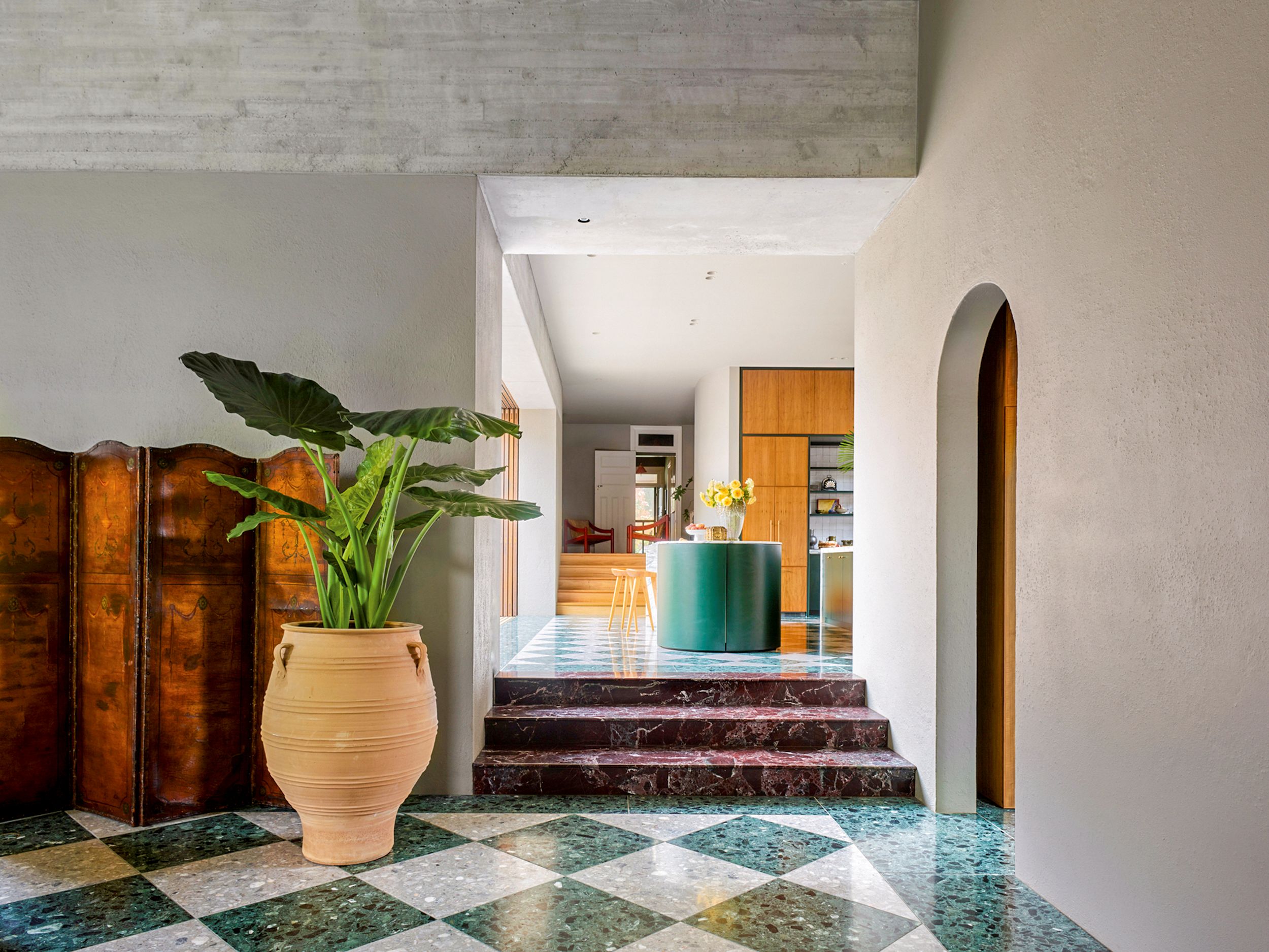 Ese enfoque se traduce en pautas concretas: madera en herringbone para pisos de áreas sociales y dormitorios; piedra mate en baños y cocinas; terrazo en ingresos, pasadizos o terrazas; y madera reciclada tanto en mobiliario como en detalles que aporten calidez. Para casas de playa, aconseja priorizar superficies resistentes como el terrazo y las maderas tropicales tratadas, capaces de soportar la humedad.