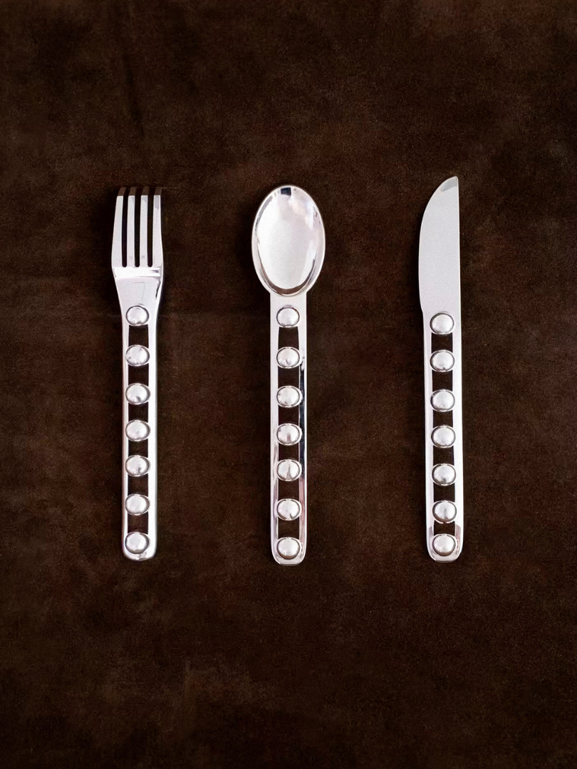 En Nueva York, la artista joyera Jessi Burch llevó su sensibilidad al territorio del hogar. Inspirada en la Seven Ball Chair de Josef Hoffmann, reinterpretó las esferas flotantes del diseño modernista en mangos metálicos que recorren el utensilio como vértebras brillantes. El resultado: un juego de mesa que se comporta como escultura funcional.
