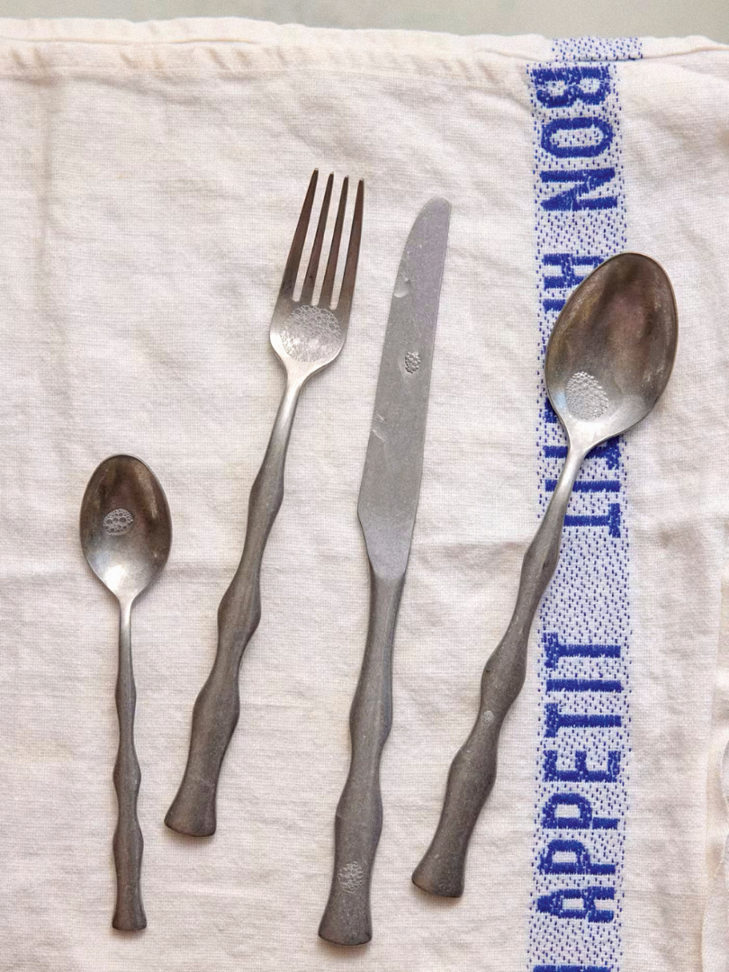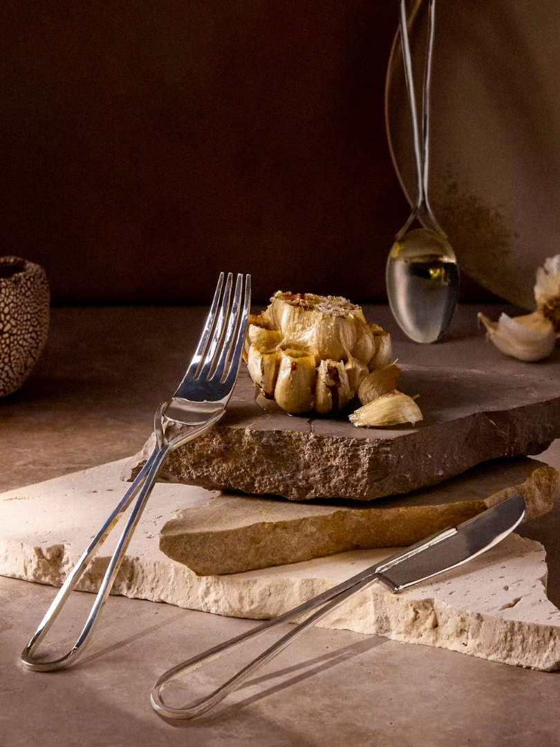 La marca Hors-d’Oeuvre desdibuja los límites entre objeto utilitario y ornamento con su colección Artifact Tea. Sus tenedores en miniatura y cucharas de doble cazoleta parecen salidas de un gabinete de curiosidades: delicadas, casi conceptuales, pero concebidas para el uso diario. Las proporciones exageradas y las líneas tensas buscan provocar, invitando a repensar la ergonomía tradicional.