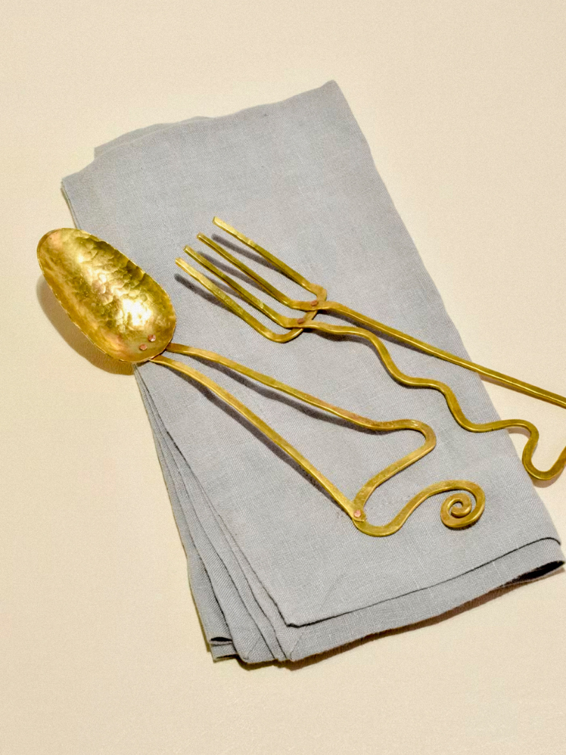 Tenedor y cuchara de servir Artefacto en latón bañado en plata de Natalia Criado