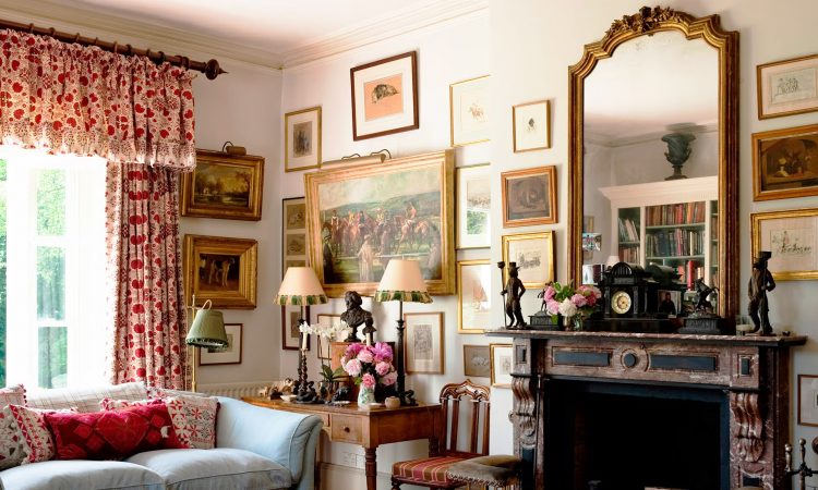 Un antiguo espejo dorado preside la repisa de la chimenea en una sala de estar formal diseñada por Joshua Pickering.