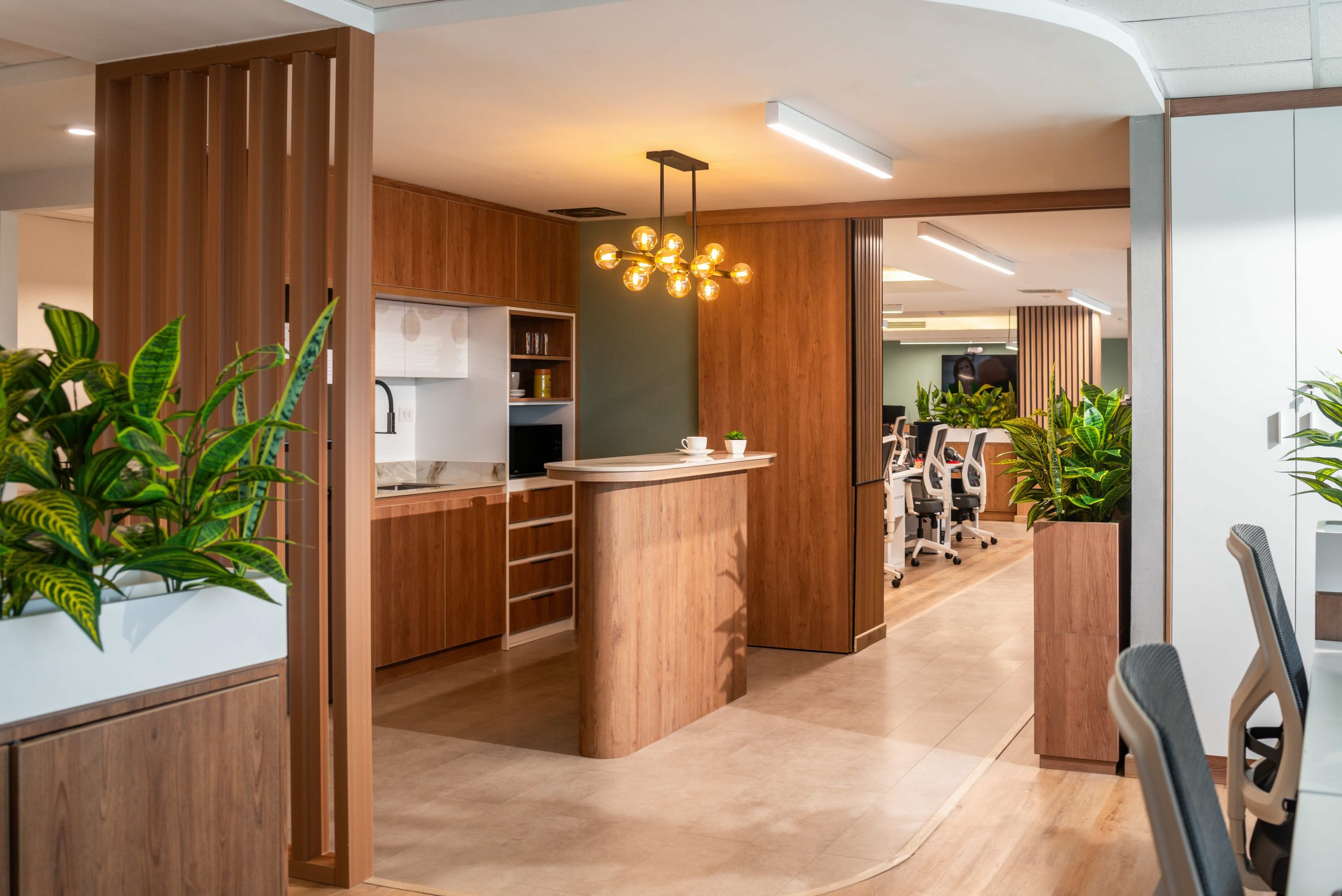 Zona de coffee point y encuentro informal, con mobiliario de madera, luminarias protagónicas y vegetación que suavizan el ritmo intenso de la oficina.