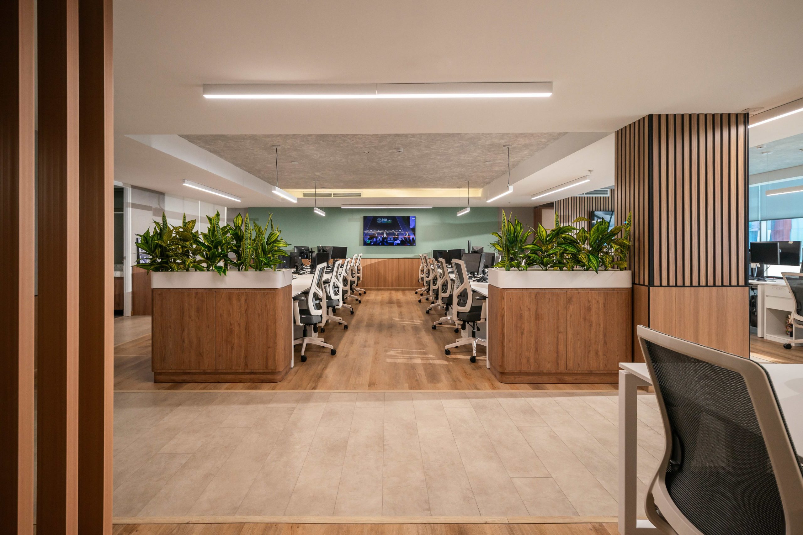Trading floor abierto con islas de trabajo rodeadas de jardineras y un diseño que favorece la colaboración, la tecnología y la visibilidad total del equipo.