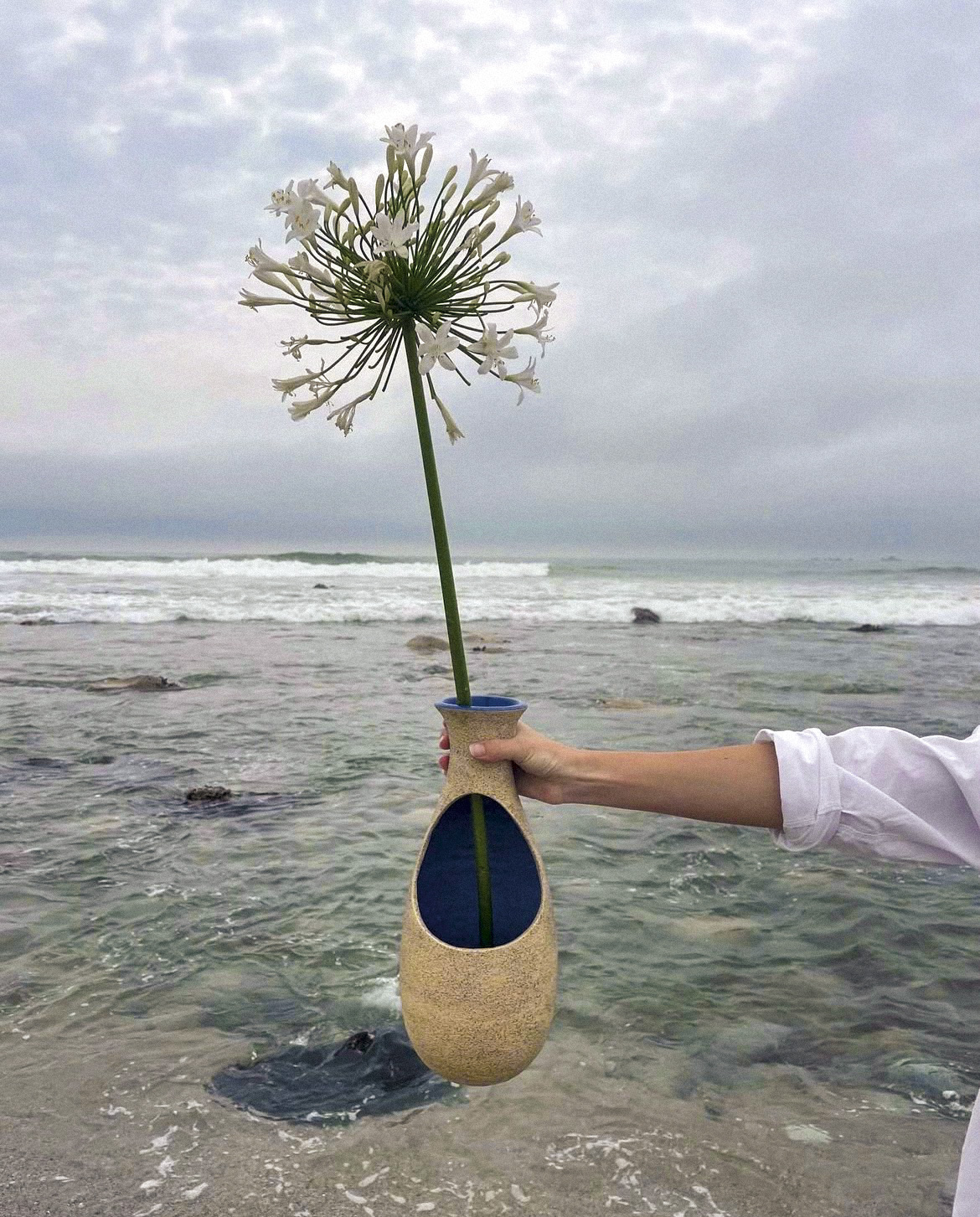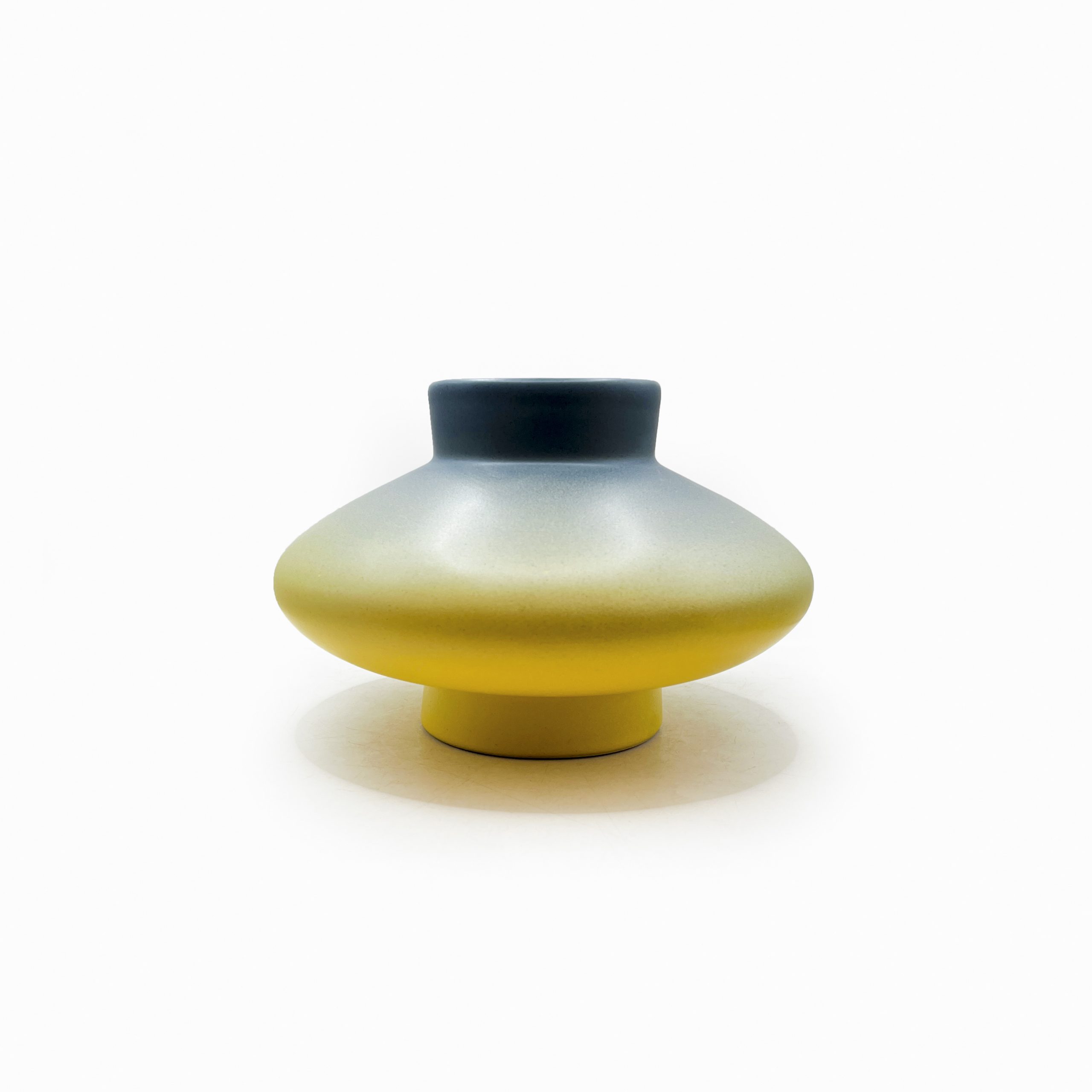 De Cotto Designs. Un florero esmaltado en el tono Siesta, un azul suave que se difumina hacia un amarillo cálido y luminoso, evocando la tranquilidad de las tardes de verano. A pedido.
