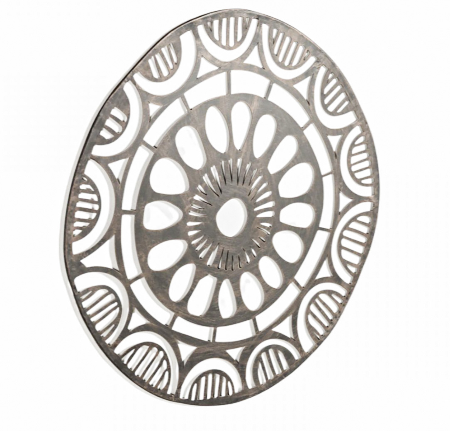 De CasaMía. Está elaborado en metal con un acabado envejecido. Sus perforaciones con motivos geométricos permiten que se vea el color de la pared al fondo.