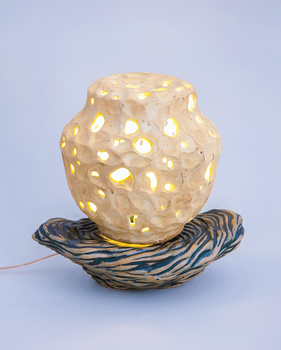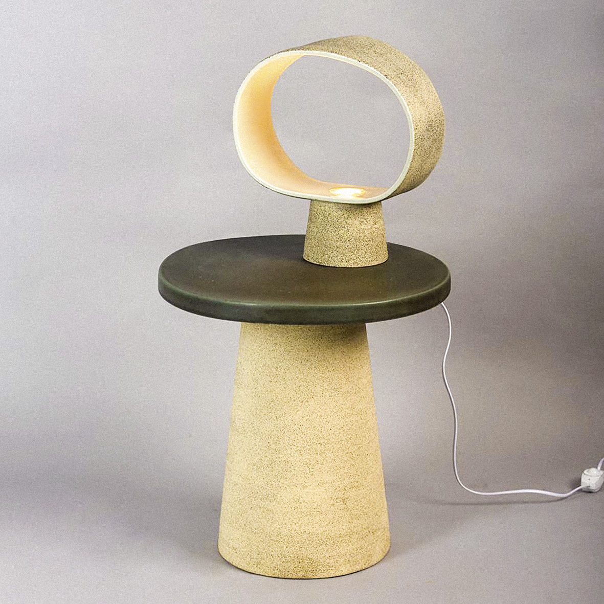 De Cer. Lámpara de cerámica gres con curva orgánica y luz suave.