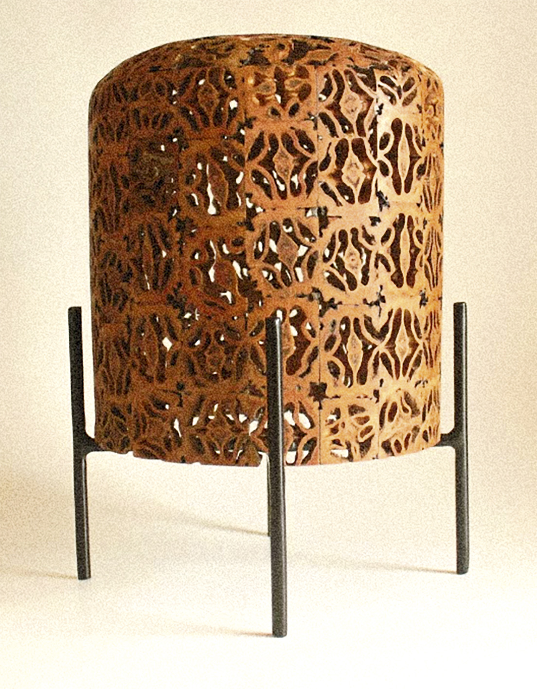 De Materia Prima. Lámpara de mesa hecha a partir de la semilla del árbol de nogal y trabajada por artesanos de Chachapoyas, complementada con una estructura metálica.