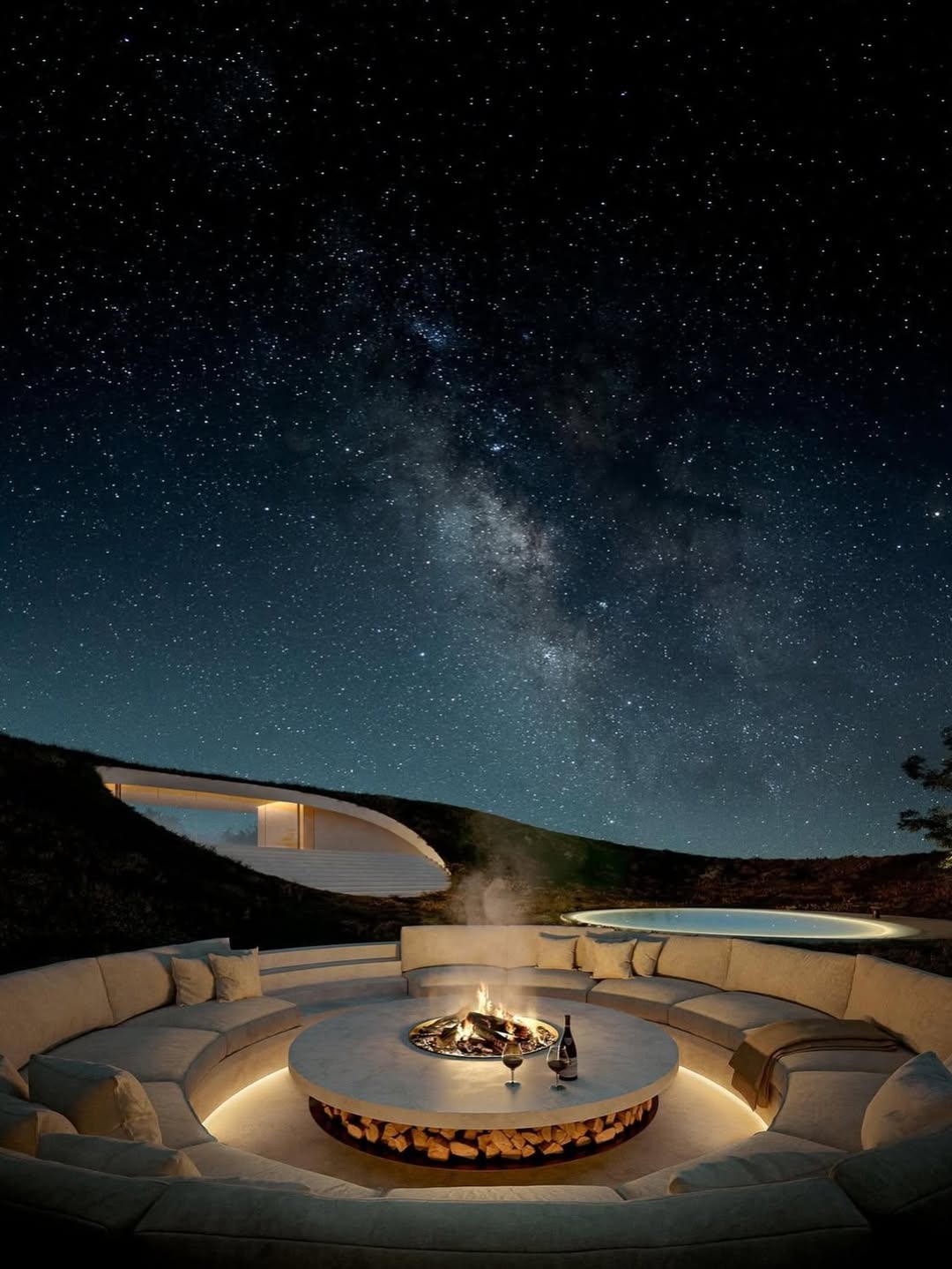 Un patio hundido con chimenea amplía el uso nocturno y conecta la vivienda con el firmamento. La estrategia espacial suma profundidad y abrigo climático, reforzando la continuidad entre interior y exterior. La piscina infinita plantea una lectura precisa del paisaje, donde cielo y agua se funden en una sola línea perceptiva.