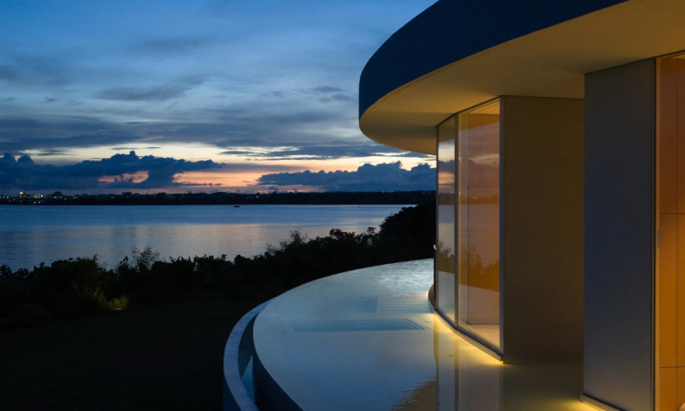 El interior alberga cuatro dormitorios y tres baños, articulados por áreas sociales que miran al cielo nocturno y al mar. Cada ambiente prioriza la experiencia sensorial: dormitorios con cerramientos de vidrio al ras del agua, gimnasio con visual frontal al horizonte y una sauna denominada “fondo del mar”, iluminada por la piscina superior. El corazón exterior incorpora piscina infinita alineada con el océano, piscina infantil y terraza en un patio resguardado por sombras naturales.