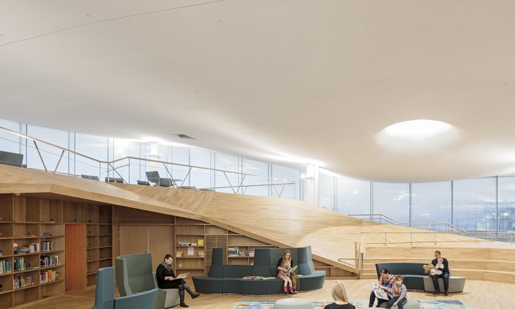 El gran atrio central conecta visualmente todos los niveles e inunda los espacios de luz natural, convirtiendo la lectura en una experiencia abierta y dinámica. Además de salas de lectura, integra espacios culturales que refuerzan su rol como punto de encuentro público.