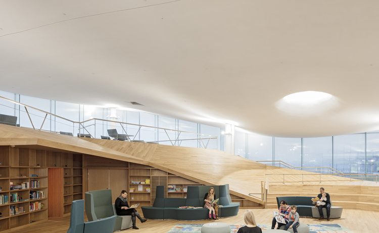 En su nivel superior, un gran espacio luminoso con vistas a la ciudad ofrece un ambiente sereno para leer, mientras que su diseño flexible promueve nuevas formas de aprender y reunirse.