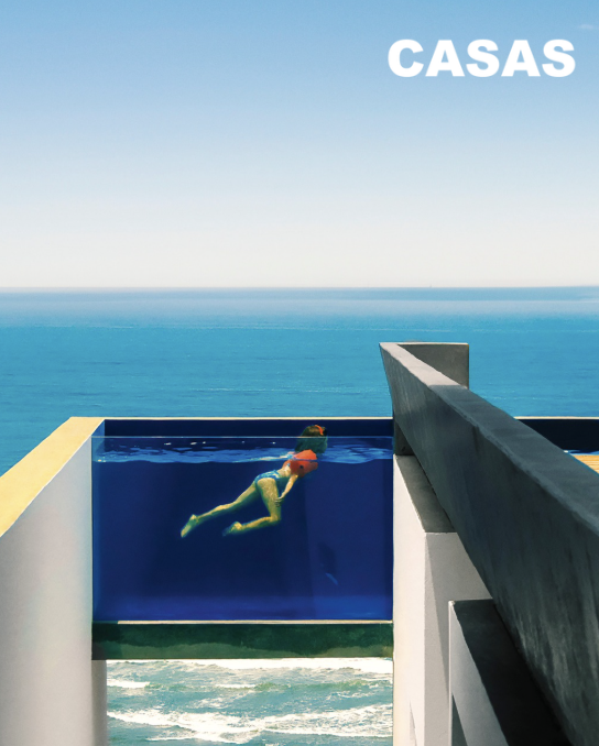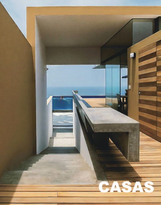 La terraza principal funciona como una extensión del desierto: una “playa artificial” donde la vida interior se prolonga hacia el exterior. Una piscina angosta y lineal acompaña esta plataforma, reforzando el horizonte continuo que une arquitectura, mar y arena.