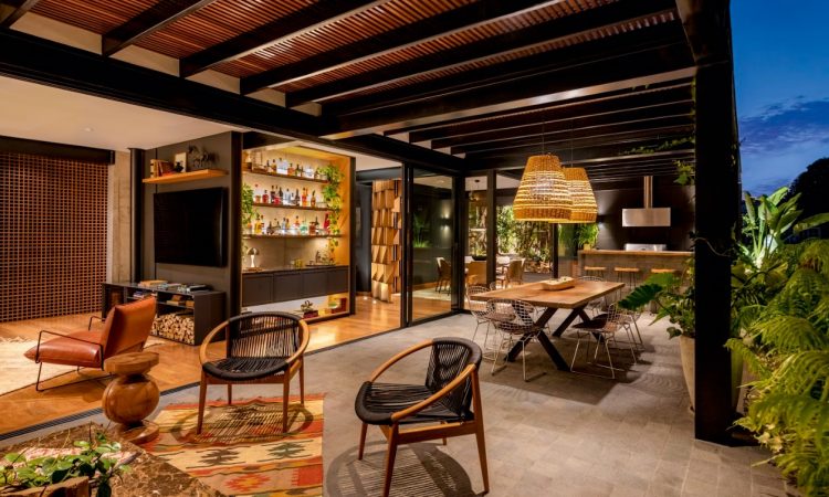 Si hay un corazón en este proyecto, es la terraza. Con vista a eucaliptos, se trabajó el paisajismo para diluir el límite entre interior y exterior. Más vegetación en el perímetro, iluminación sutil con estacas y grandes lámparas de fibras naturales permiten que el espacio funcione tanto de día como de noche.