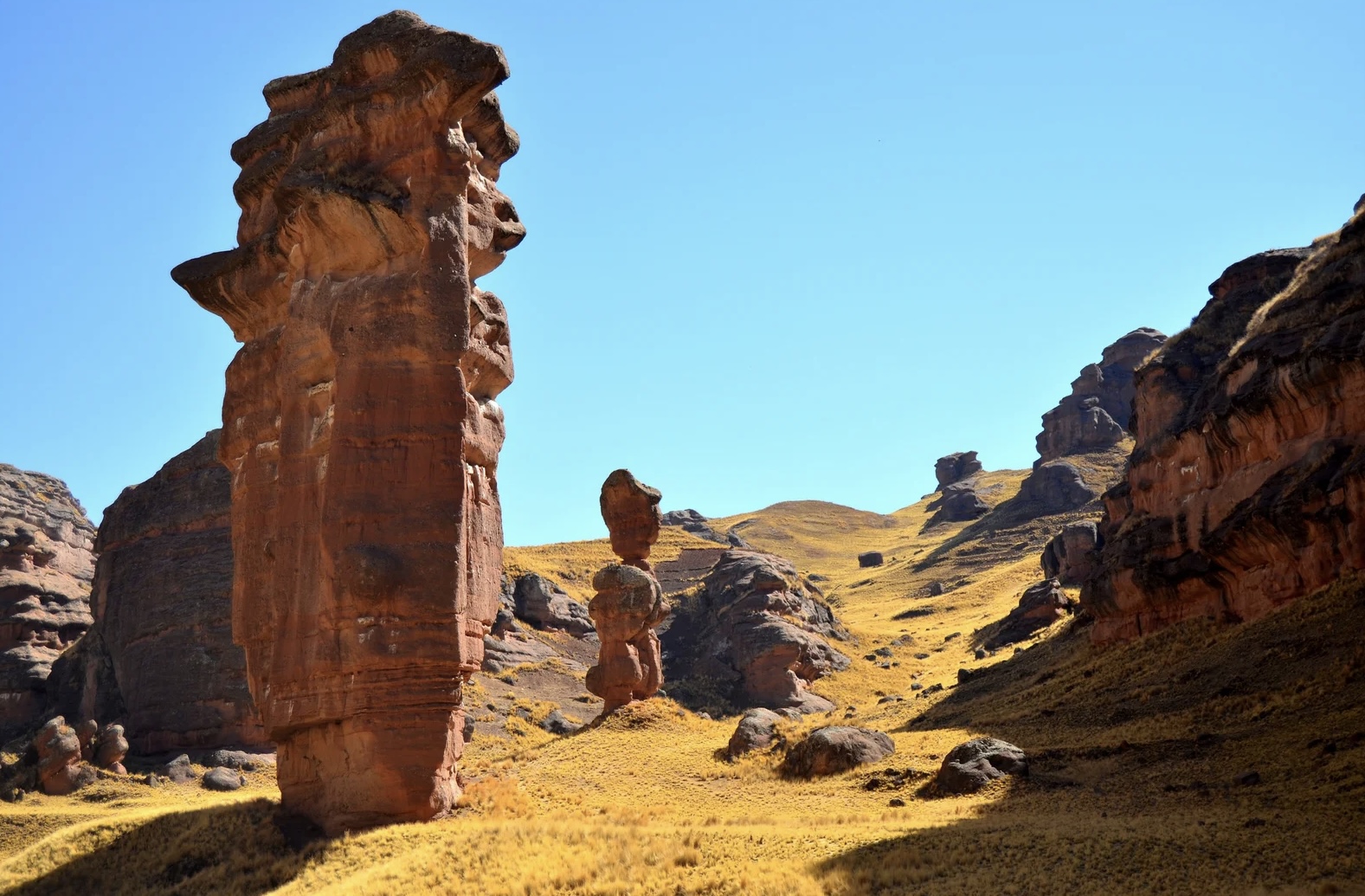 En el altiplano de Puno, el cañón de Tinajani reúne formaciones rocosas de gran escala que emergen sobre el terreno. Producto de la erosión, estas estructuras presentan formas irregulares que marcan el carácter del lugar.