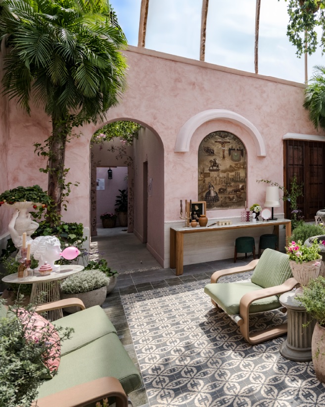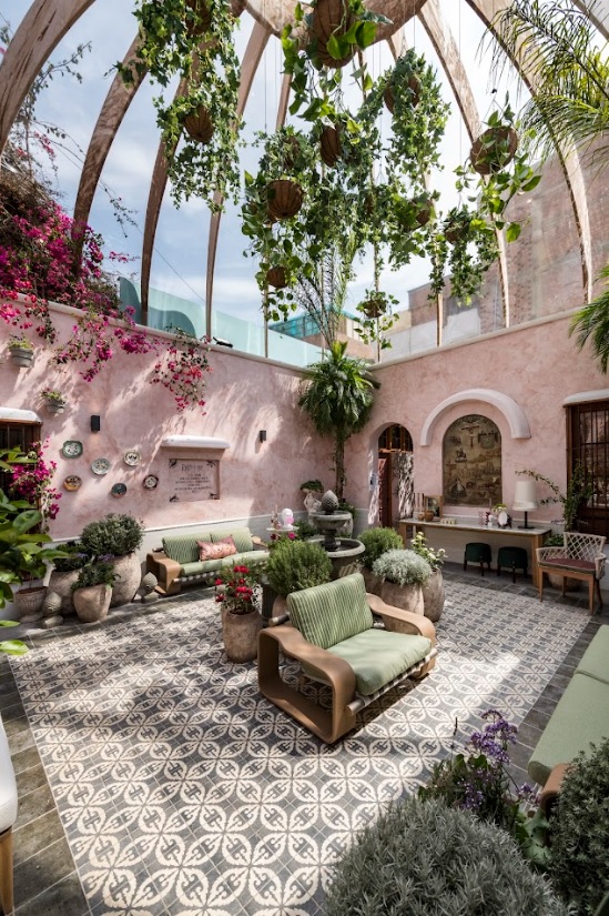 Patio interior de una casona del siglo XVII intervenido con vegetación colgante, luz natural y materiales que recuperan la memoria del espacio.