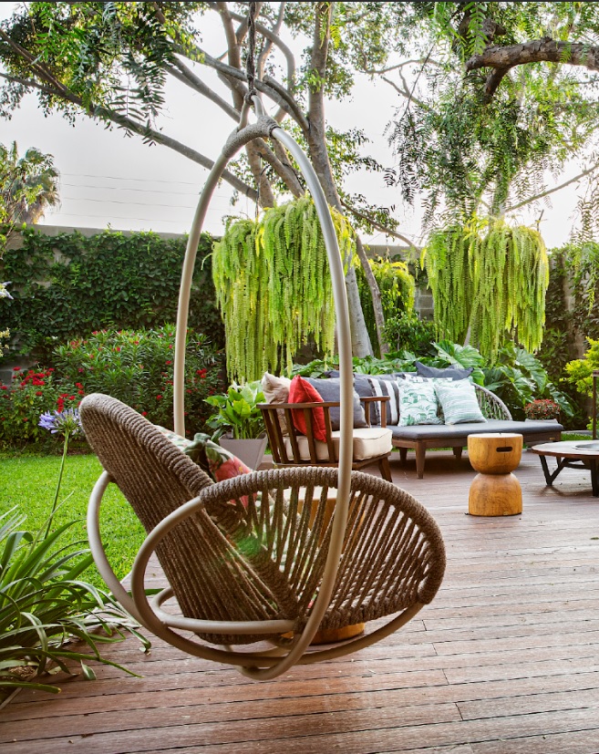 Área exterior que prolonga la experiencia del interior, con materiales naturales y vegetación.