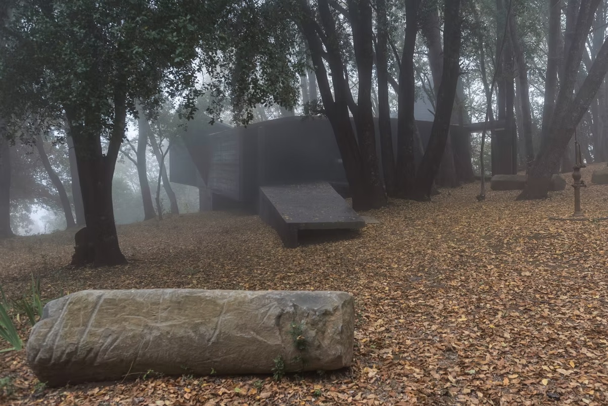 La estructura se impone en el bosque del Maule con una presencia sólida y rotunda.