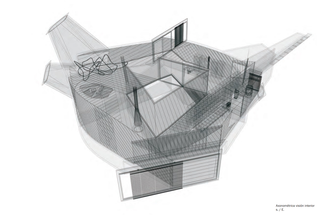 La visión axonométrica permite entender la distribución interior de la obra, donde los espacios fluyen sin divisiones tradicionales bajo una cubierta que juega con ángulos y aperturas de luz.