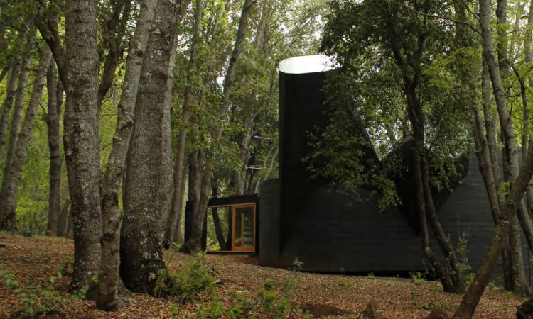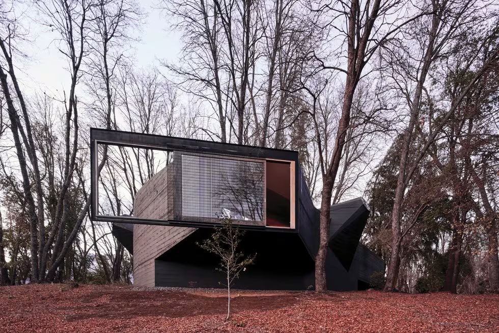 Si uno camina por los senderos de Vilches, lo último que espera encontrar entre las casas de madera y techos de zinc es un volumen monolítico de hormigón pintado de negro. La Casa para el Poema del Ángulo Recto se percibe como una roca volcánica integrada naturalmente en el paisaje.