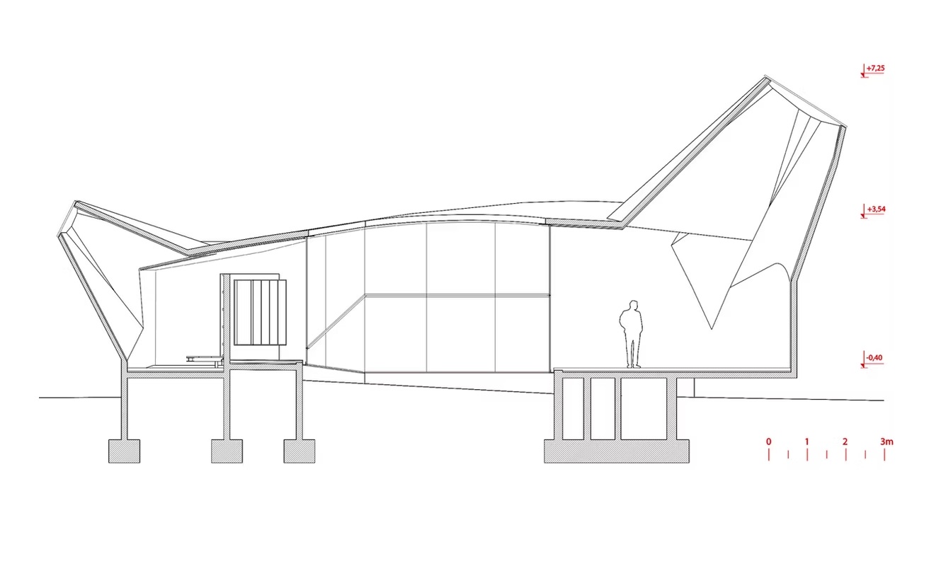 Este plano de corte revela la compleja geometría del refugio y cómo su estructura se eleva sobre el terreno, alcanzando una altura máxima de más de 7 metros en su punto más radical.