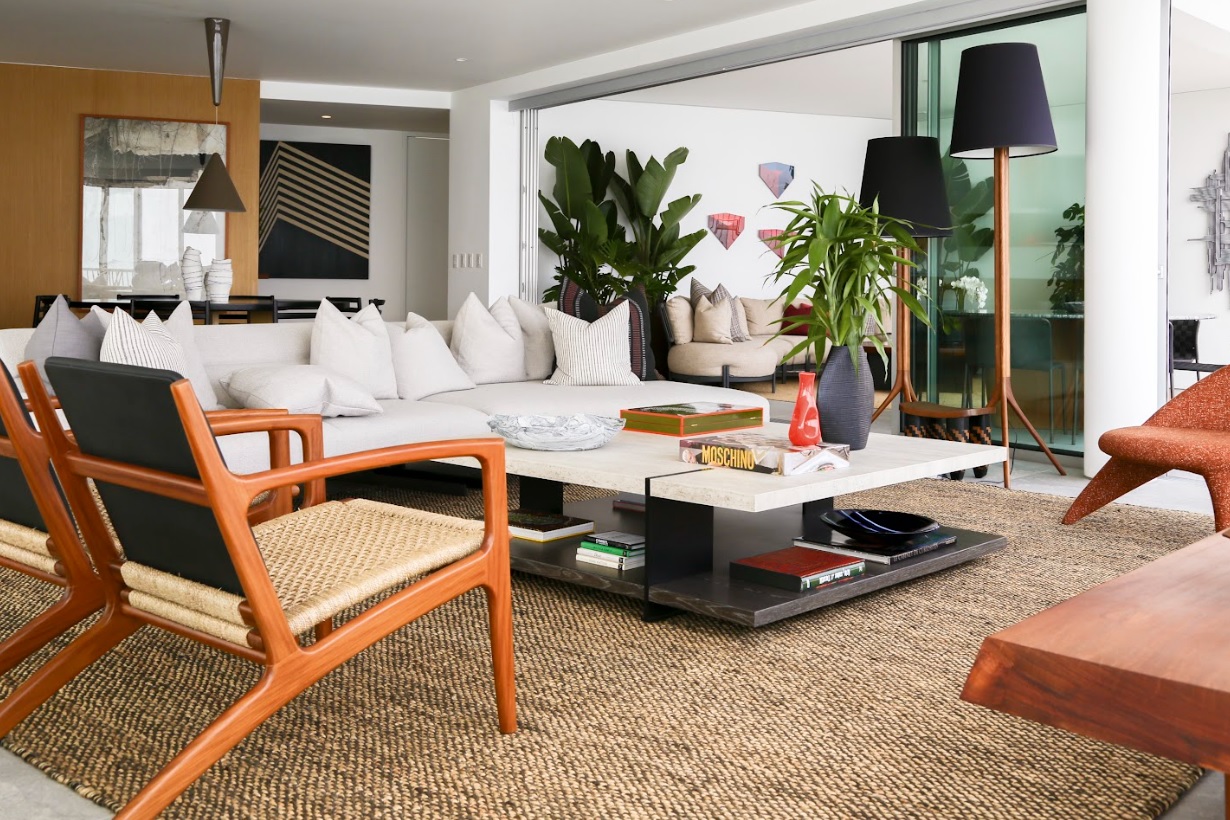 Muebles de líneas simples, alfombras de fibras naturales y piezas de diseño conviven en un ambiente social pensado para reunirse y disfrutar con calma.