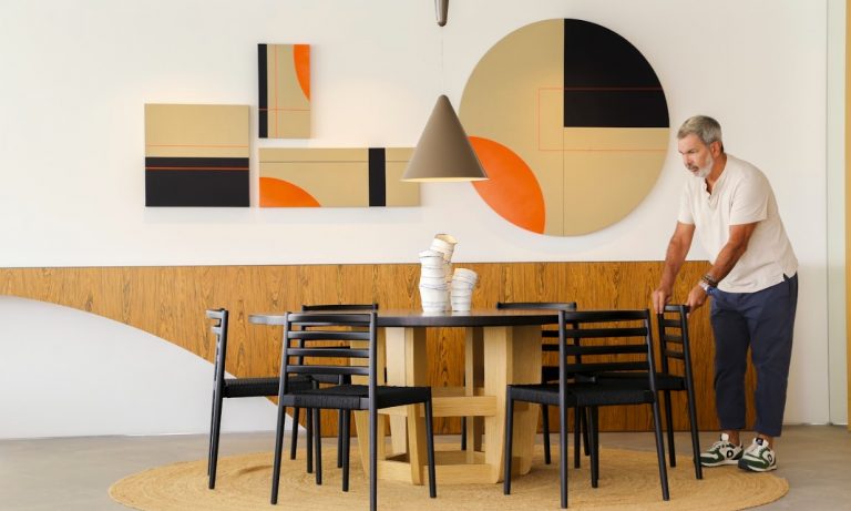 El comedor mantiene la misma lógica. Una mesa redonda de madera se ubica sobre una alfombra de fibras naturales, generando un ambiente íntimo dentro del espacio abierto. Sobre el muro, una composición de obras geométricas introduce acentos de color que dialogan con los tonos cálidos del interior.