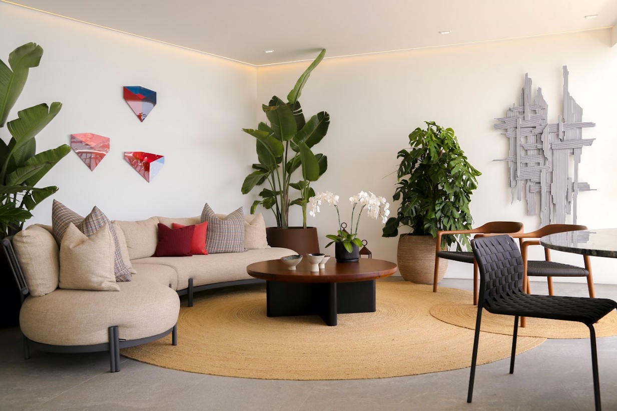 Rincón de conversación con piezas orgánicas, vegetación exuberante y luz natural.