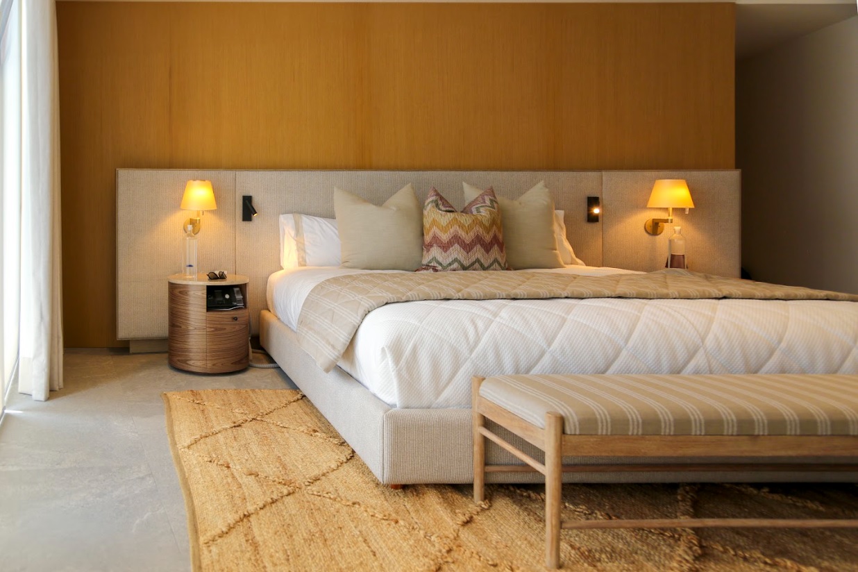 En las áreas privadas, el proyecto mantiene la misma búsqueda de serenidad. El dormitorio principal se resuelve con una paleta suave de textiles claros, madera y fibras naturales. Un gran panel de madera detrás de la cama aporta calidez al ambiente, mientras que la iluminación indirecta crea una atmósfera tranquila.