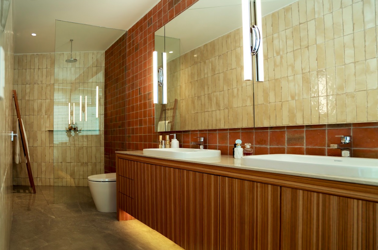 Baño moderno con revestimientos cerámicos en tonos tierra y muebles madera.